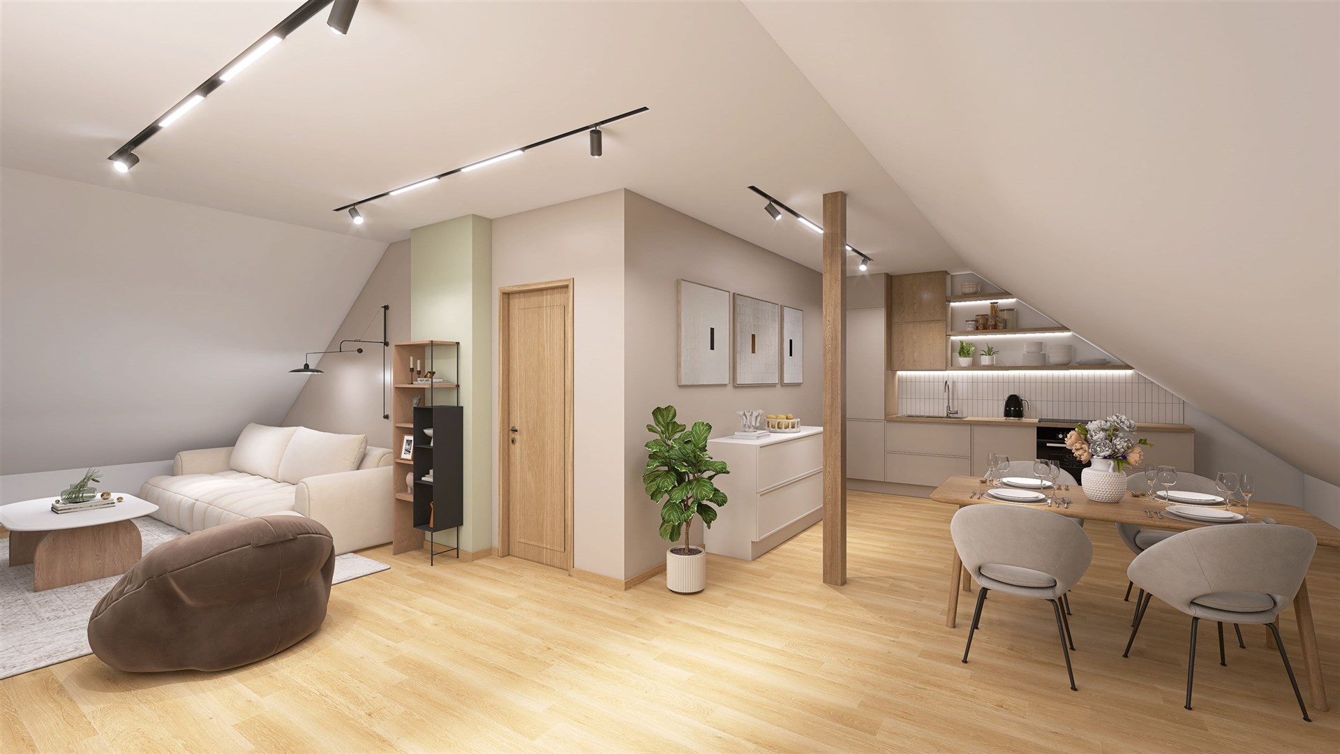 V přízemí se nachází 70 m² užitné plochy, kde najdete samostatnou kuchyni (12 m²), obývací pokoj (23 m²), ložnici (15 m²), koupelnu, samostatnou toaletu a předsíň. Kuchyně navíc nabízí možnost propojení s obývacím pokojem, díky čemuž lze vytvořit moderní otevřený prostor o velikosti 35 m². V podkroví se nachází jeden pokoj o velikosti 23 m² a balkon o ploše 5 m. Dalších 40 m² v podkroví je připraveno k dostavbě, což vytváří možnost vybudování dalšího obytného prostoru, například jednotky 2+kk nebo 2+1.