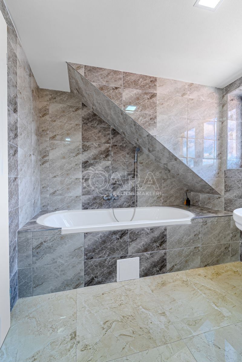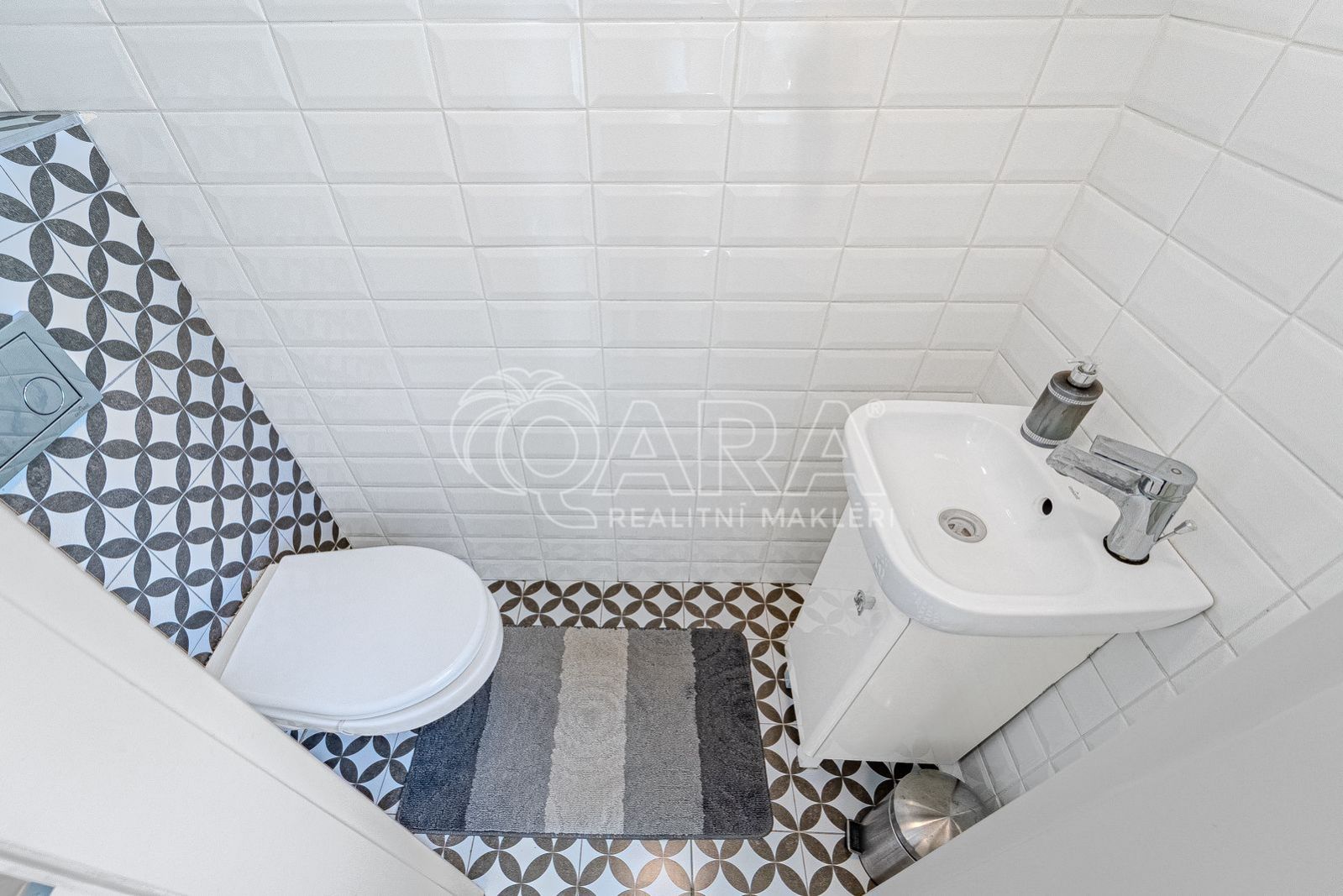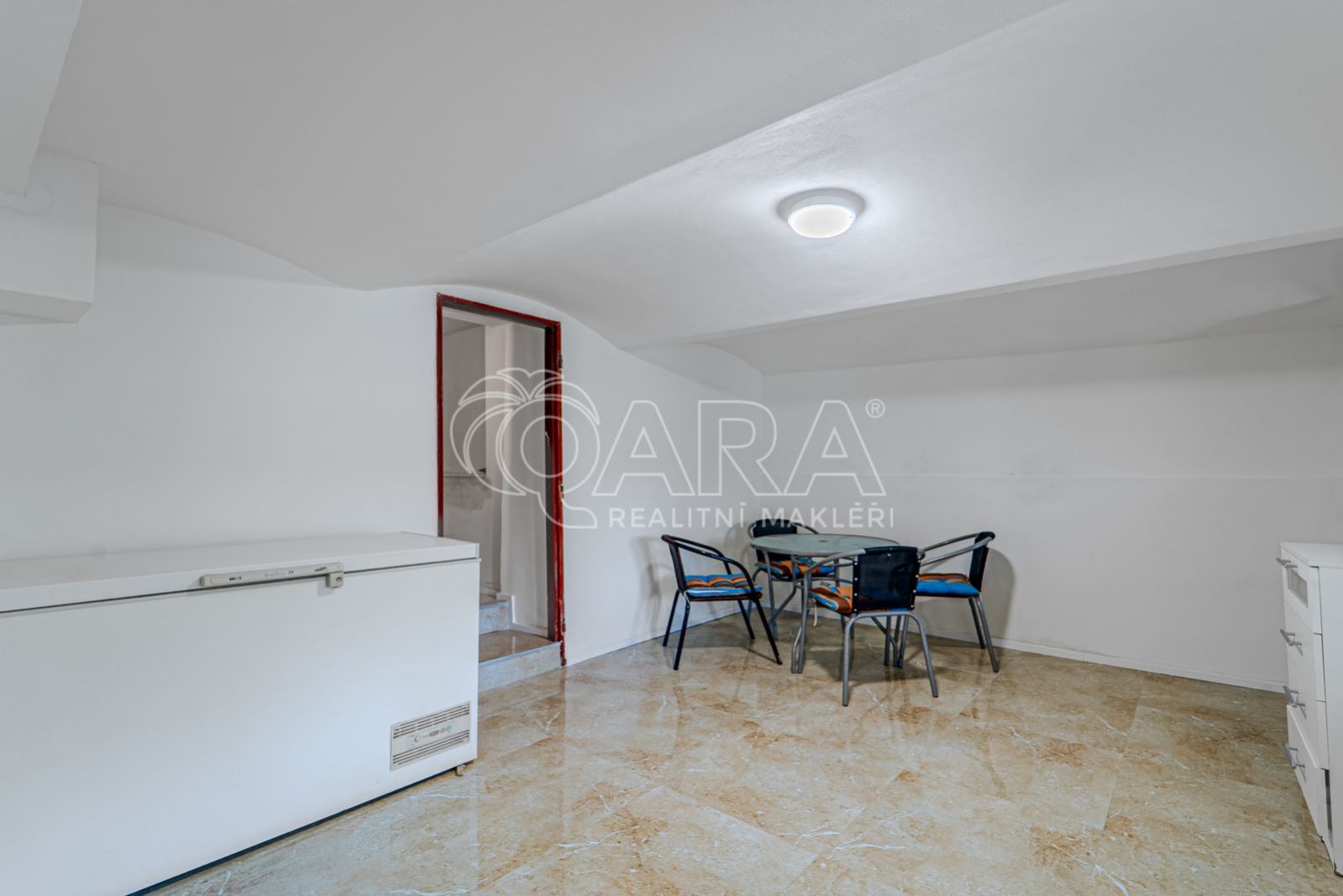 Přízemí: Ze zádveří vedou schody do suterénu a do zvýšeného přízemí. Zde se nachází prostorný obývací pokoj propojený s moderní kuchyní, velká prosluněná jídelna s nádherným a klidným výhledem do zahrady a na přilehlý les, ložnice s komorou a s přímým vstupem do koupelny vybavené sprchovým koutem a vanou, a dále samostatná toaleta.