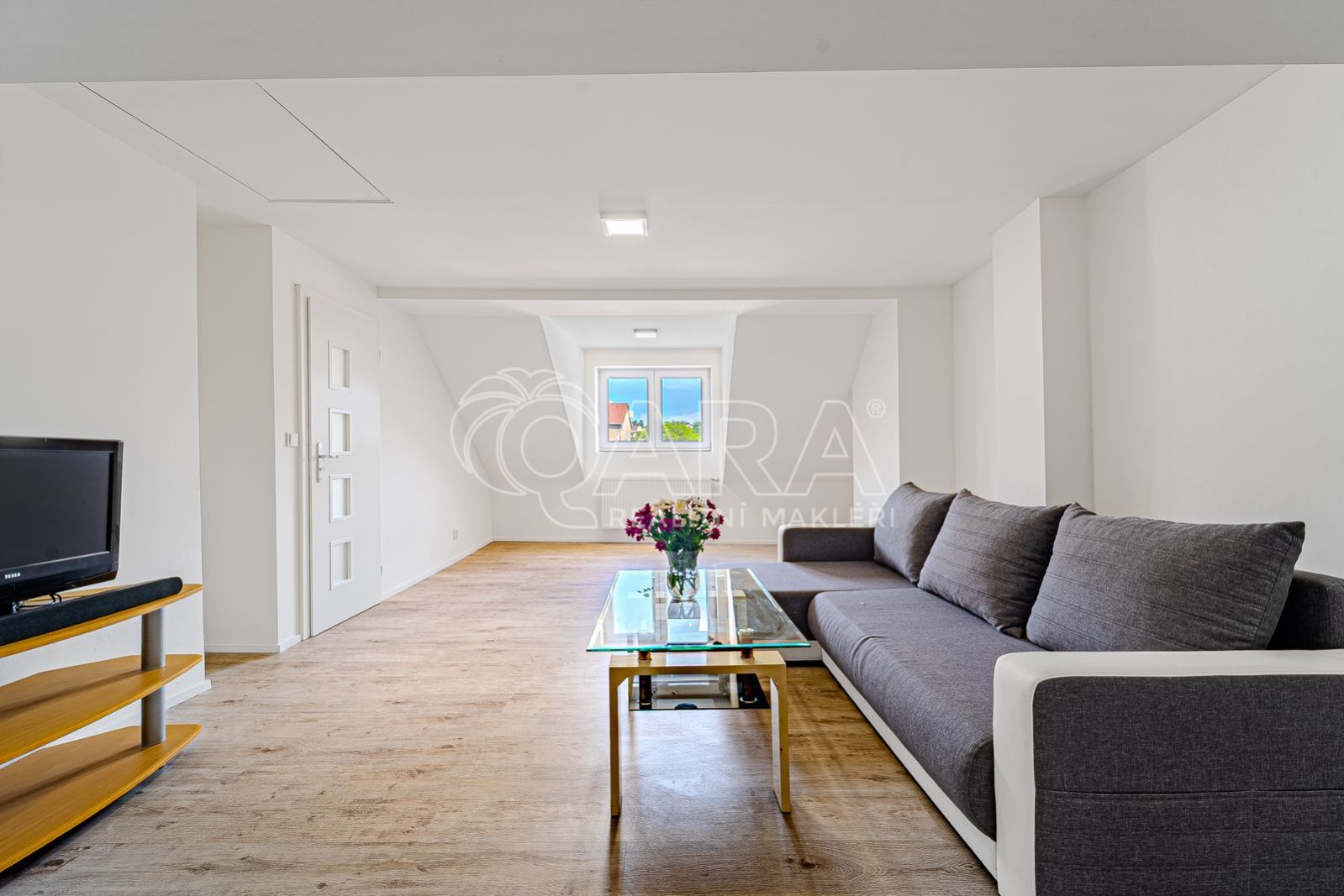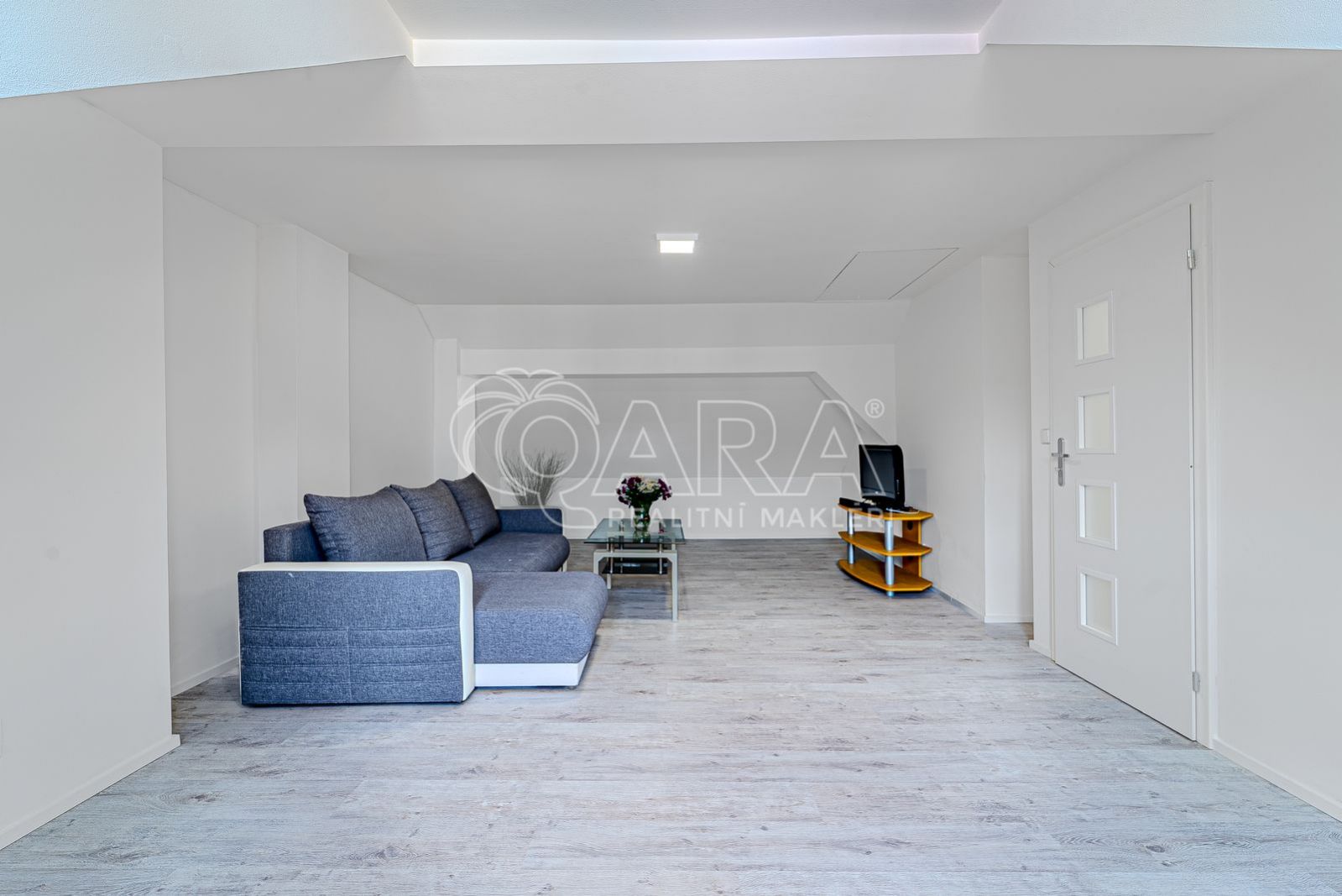 Obytné podkroví: Nabízí dvě samostatné, světlé místnosti (velká cca 25m2 a malá cca10m2) a koupelnu s vanou a toaletou.