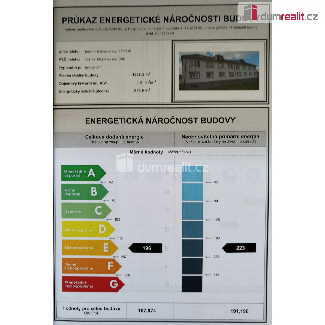 Dle platné legislativy je pro dům zpracován PENB, kdy stavba je zařazena do energetické třídy E. Cena je včetně právního servisu. Tuto nemovitost lze hradit hypotečním úvěrem, který Vám rádi pomůžeme vyřídit v našem hypotečním centru. Ev. číslo: 652341.