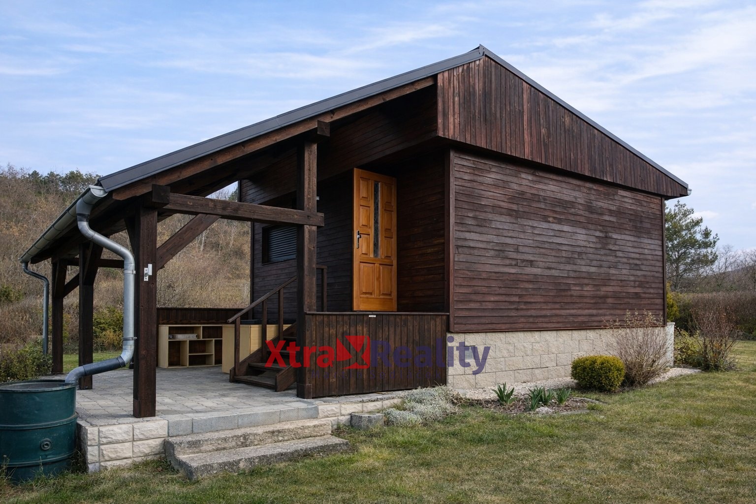 Před chatkou byla vybudována rozlehlá zastřešená terasa, ze které je překrásný výhled do údolí na řeku Ohři.