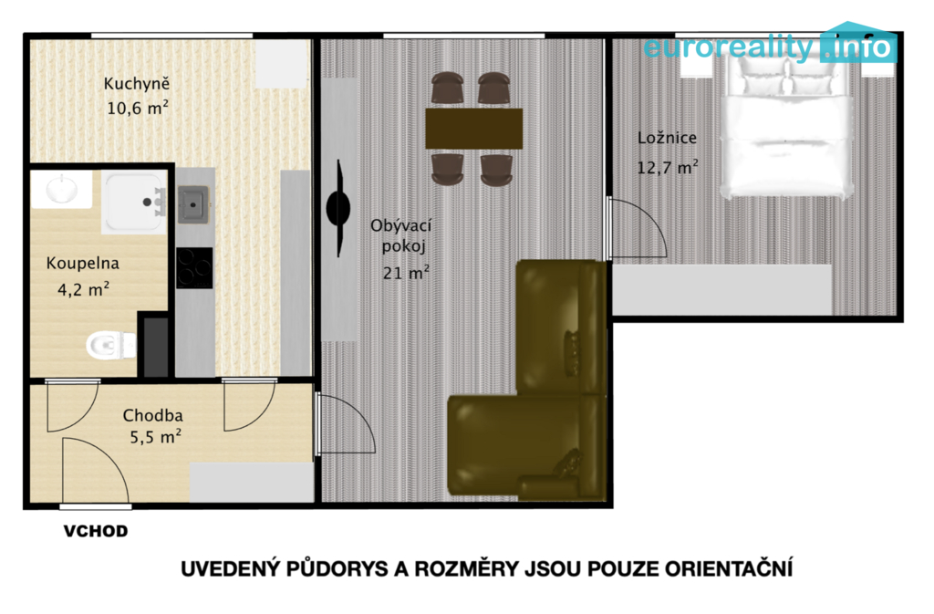 Dispozici tvoří velký obývací pokoj, ložnice, samostatná kuchyně, koupelna, toaleta a prostorná chodba s dostatkem místa pro úložné prostory.