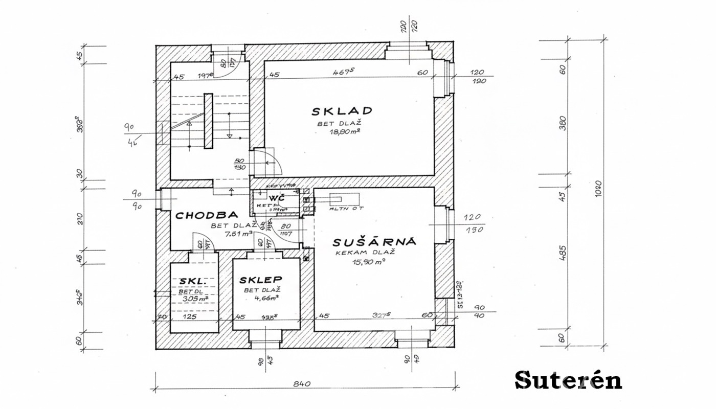Vnitřní dispozice: 1. PP (suterén), dva sklípky o celkové ploše (7,7 m2), úložný prostor na zahradní nářadí, místnost 15,9 m2 (je zde kotel, ale je možné ho stavebně oddělit), WC s umyvadlem (1,2 m2), letní místnost (18 m2), chodba (7,6 m2), východ do zahrady, v mezipatře balkon orientovaný na jih.