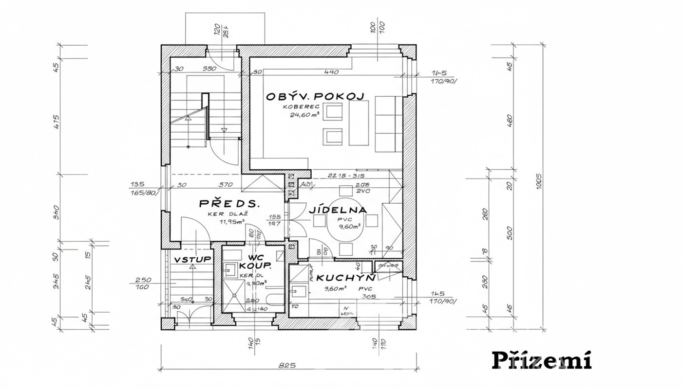 1. NP (přízemí) vstupní hala, obývací pokoj (24,6 m2) je propojen s jídelnou (9,6 m2), kuchyně (7,3 m2), koupelna s WC 4,9 m2, chodba 12 m2