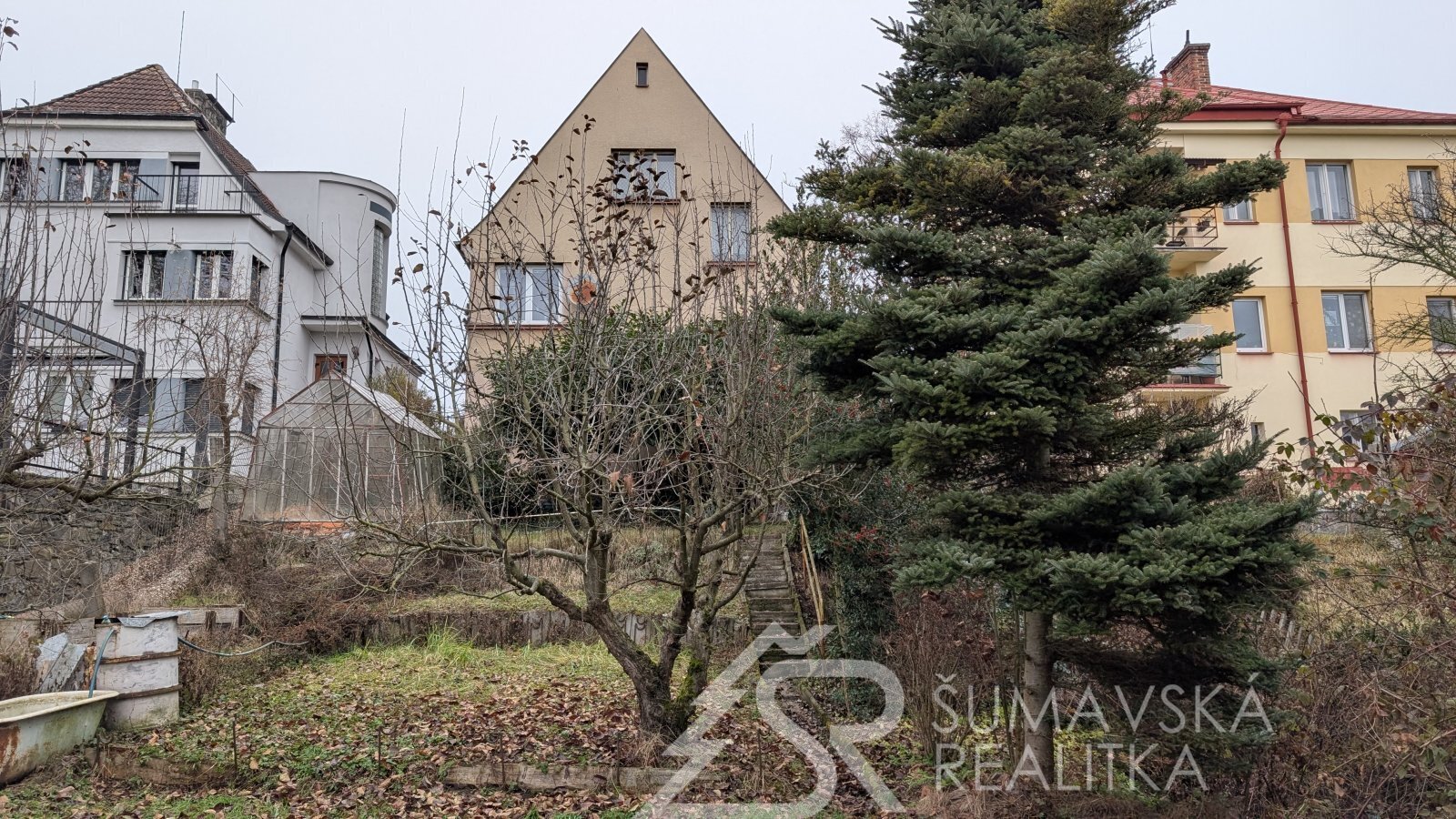 Na zahradě se nachází skleník a samostatně stojící garáž ( 20m2). Přístup do zahrady je možný z vedlejší cesty, chráněný pojezdovou bránou, která slouží pro tři rodinné domy. Následuje další, vlastní brána vedoucí přímo na pozemek domu.