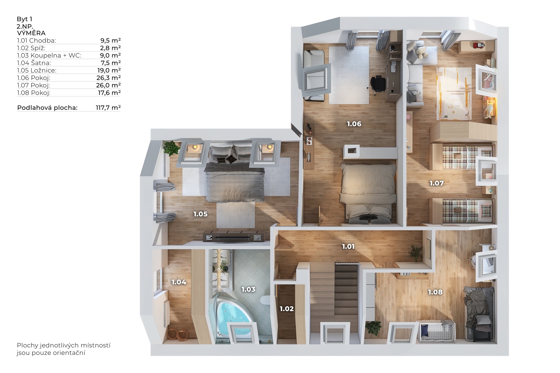 - Jednotka 5+1: Obývací pokoj s krbem, kuchyně, vstupní chodba, dvě koupelny s toaletou, 3 ložnice (jedna s šatnou) a pracovna.
