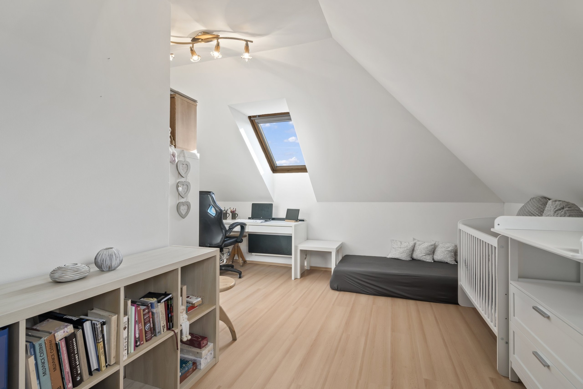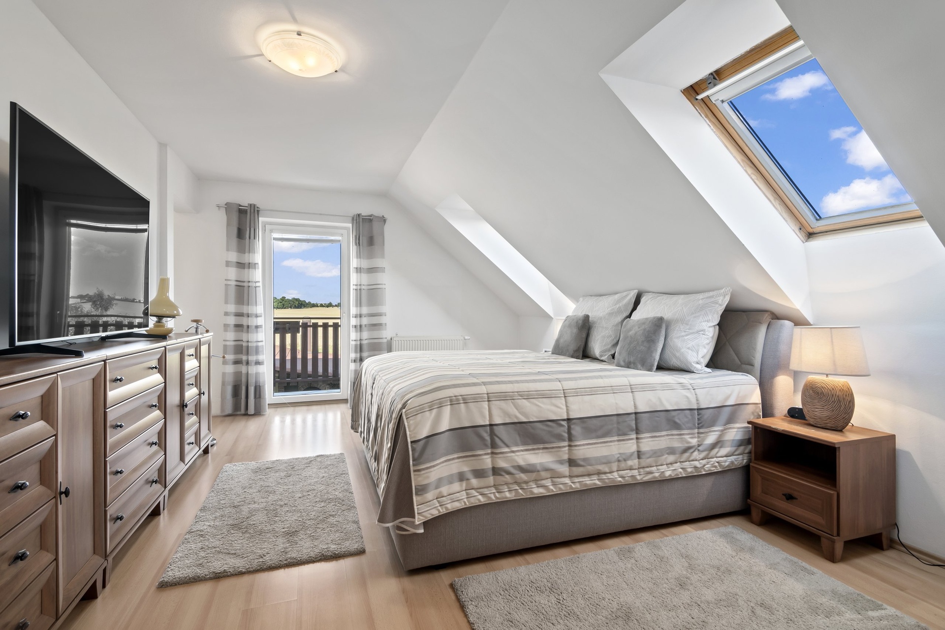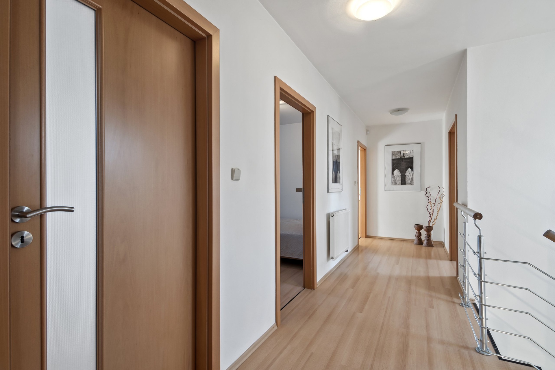 V horním patře se nachází tři ložnice, z toho jedna ložnice s šatnou. Pokoje jsou tak velké, že jdou zástěnou v klidu opticky rozdělit na spací a denní část. Další místností je pracovna. V horním patře se dále nachází koupelna s vanou a toaletou.