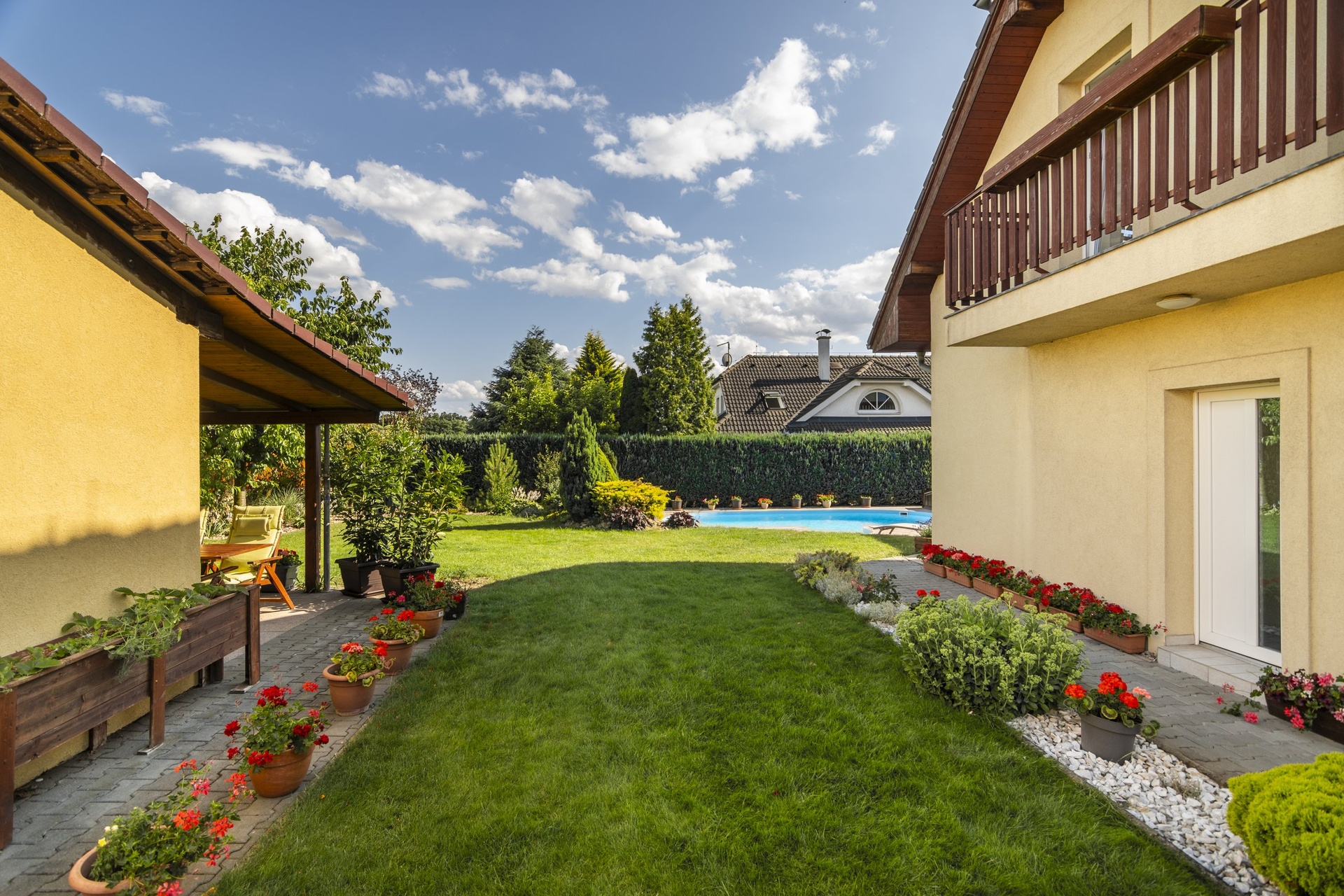 Rovinatá zahrada nabídne hned několik udržovaných keřů, které navozují velmi příjemnou atmosféru.
