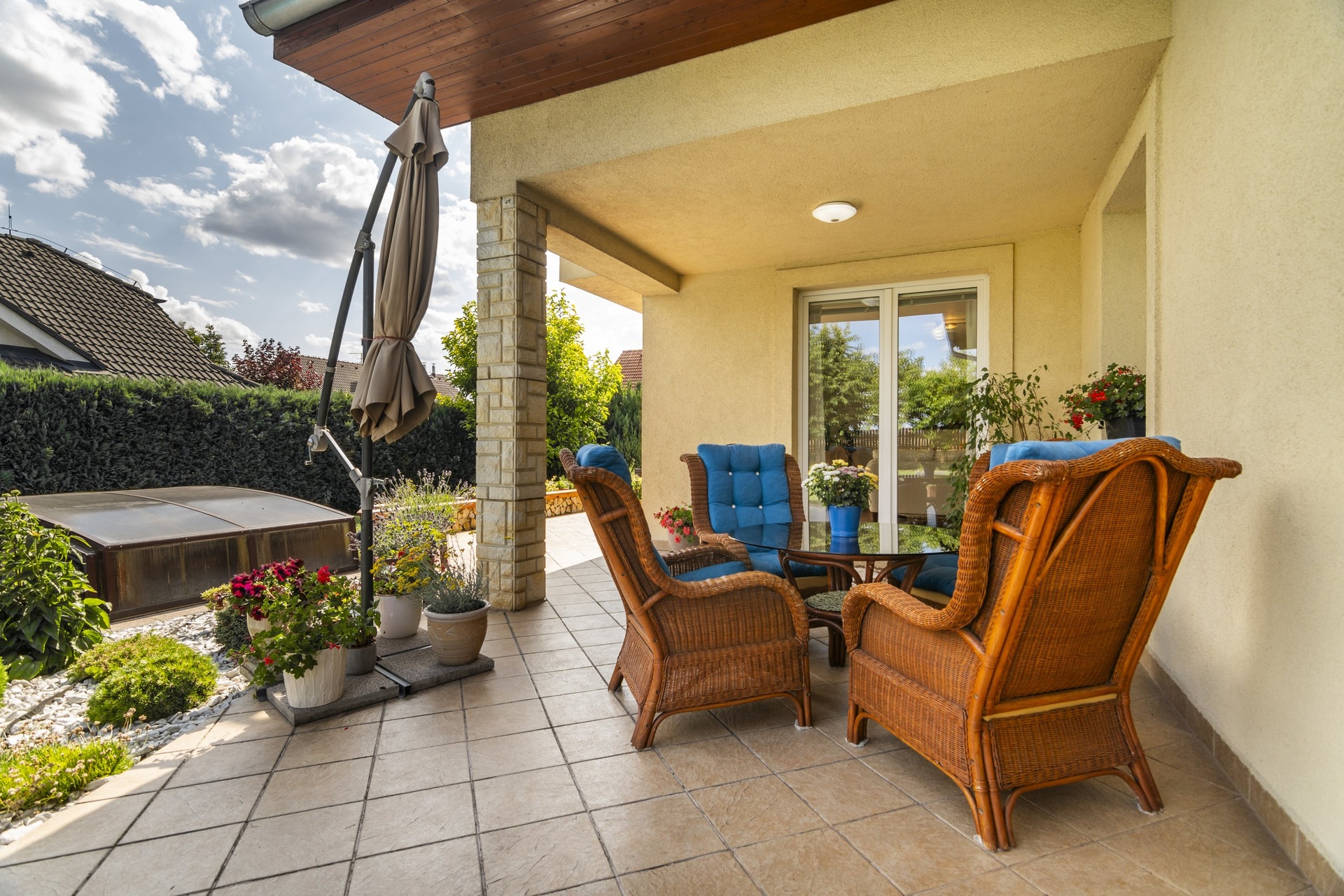 Na zahradě ještě nachází garáž a na ní navazující pergola. Zde je dostatek místa jak pro pohodlné sezení, tak pro vestavěný gril.