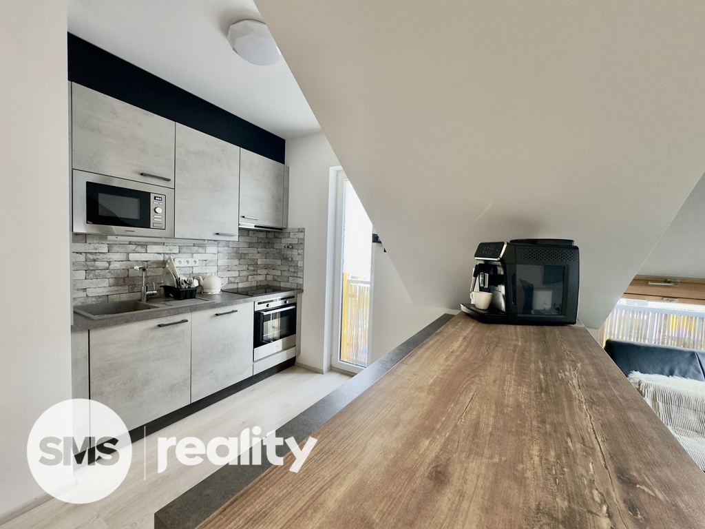 Byt se nachází v posledním patře budovy s výtahem. Interiér se pronajímá jako částečně zařízený – součástí je pevně zabudovaný nábytek (kuchyně, šatní skříně), ostatní nábytek viditelný na fotografiích není součástí pronájmu.