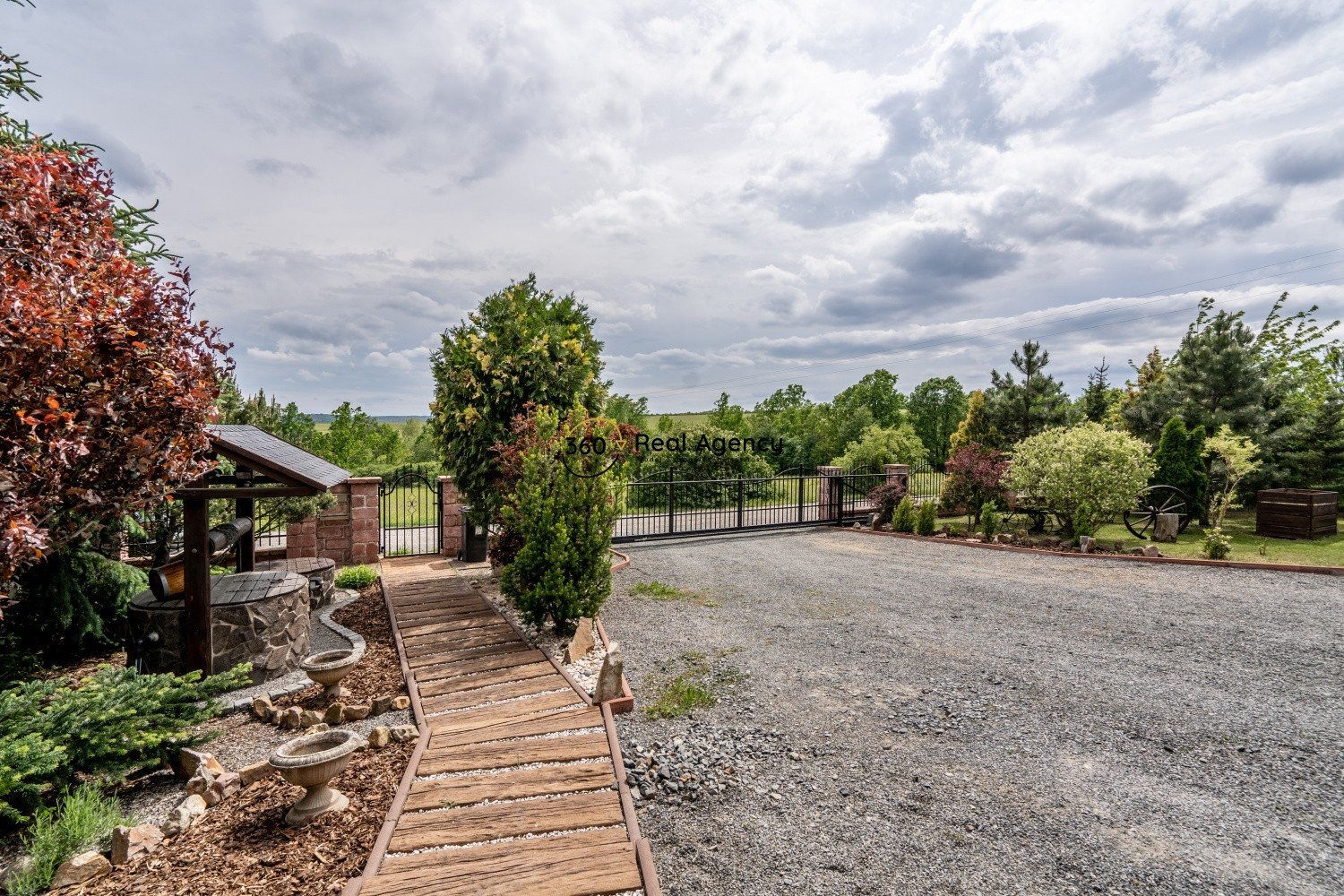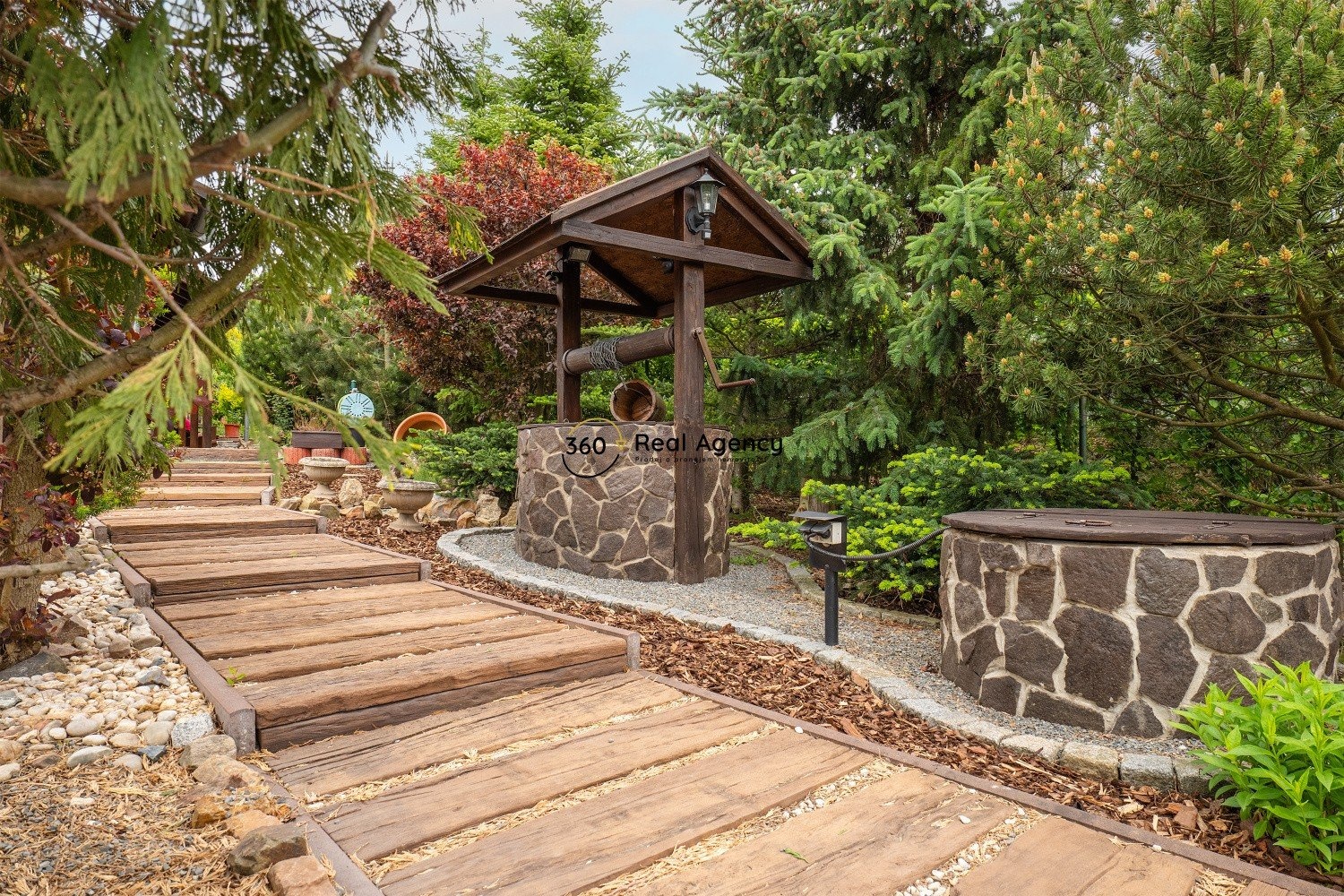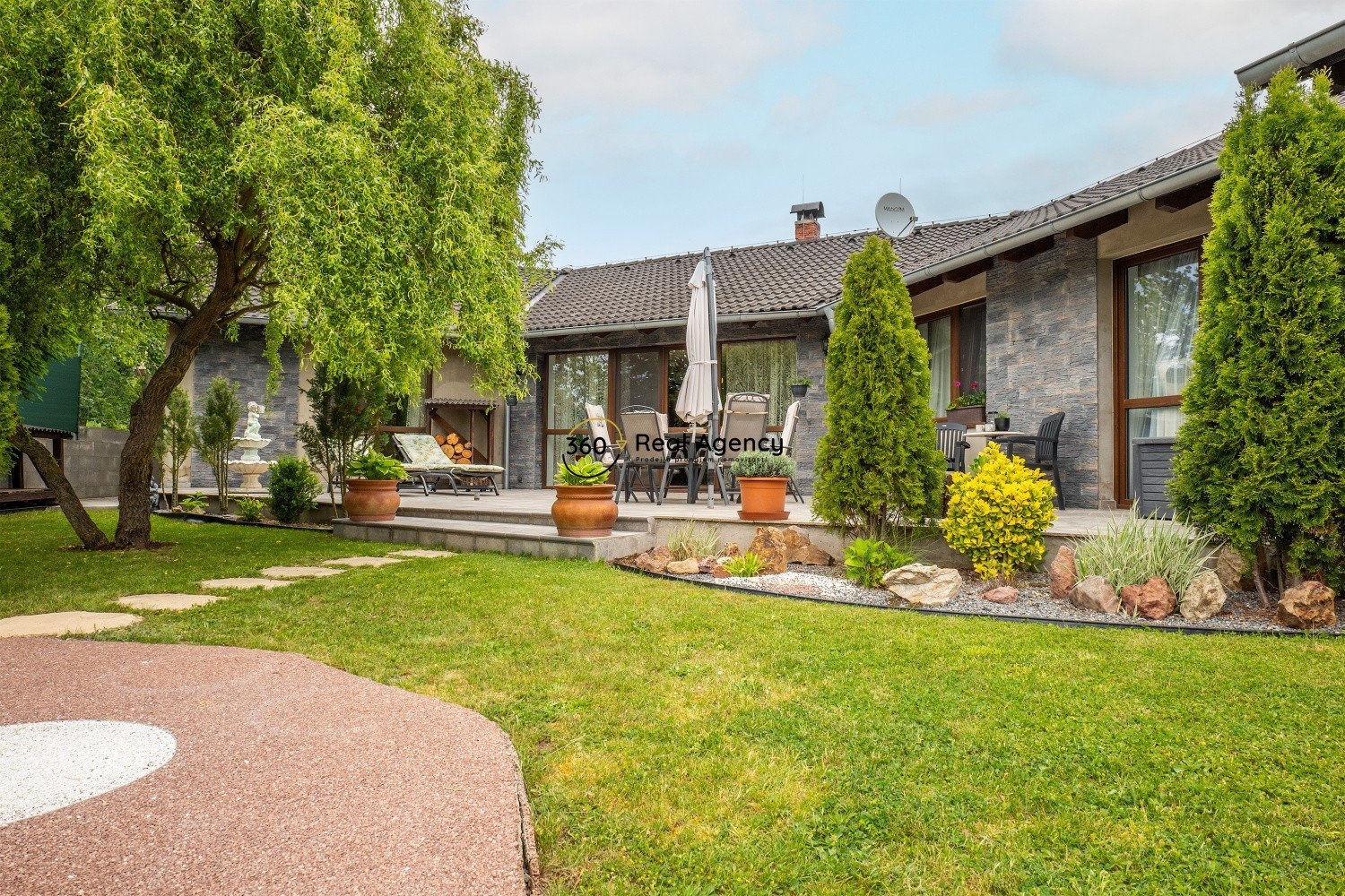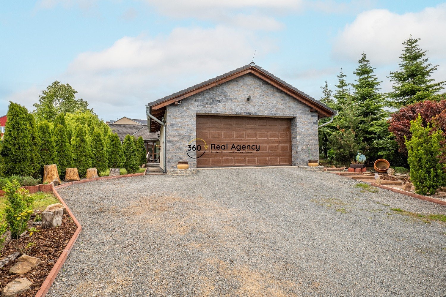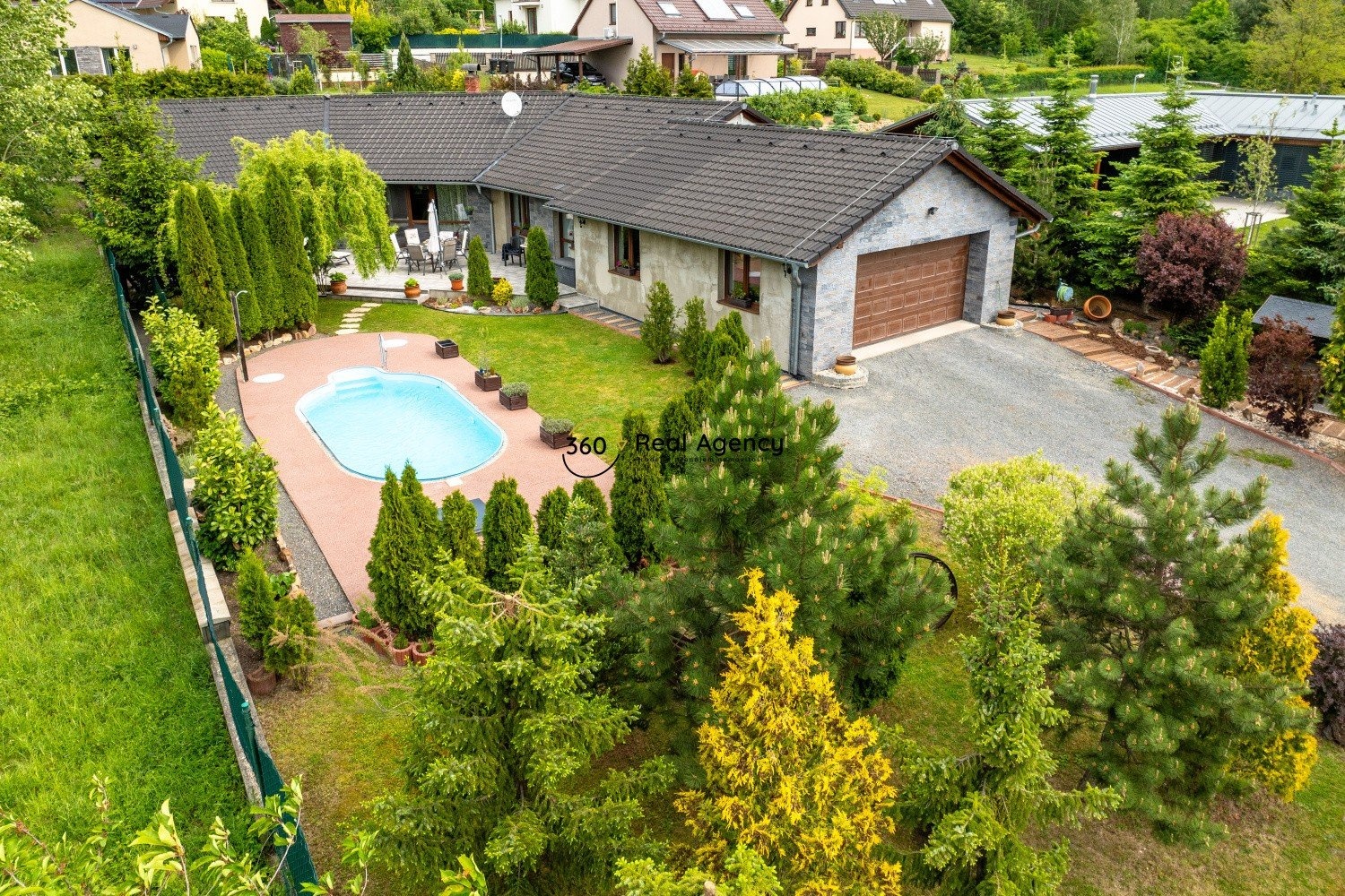 Pozemek je osázen okrasnou zelení, která zajišťuje dostatek soukromí. Najdete zde terasu, bazén, zahradní kolnu, retenční nádrž i několik odpočinkových zákoutí. Na jižní straně nemovitost sousedí s volným prostranstvím a otevírá se odtud krásný výhled do přírody.
