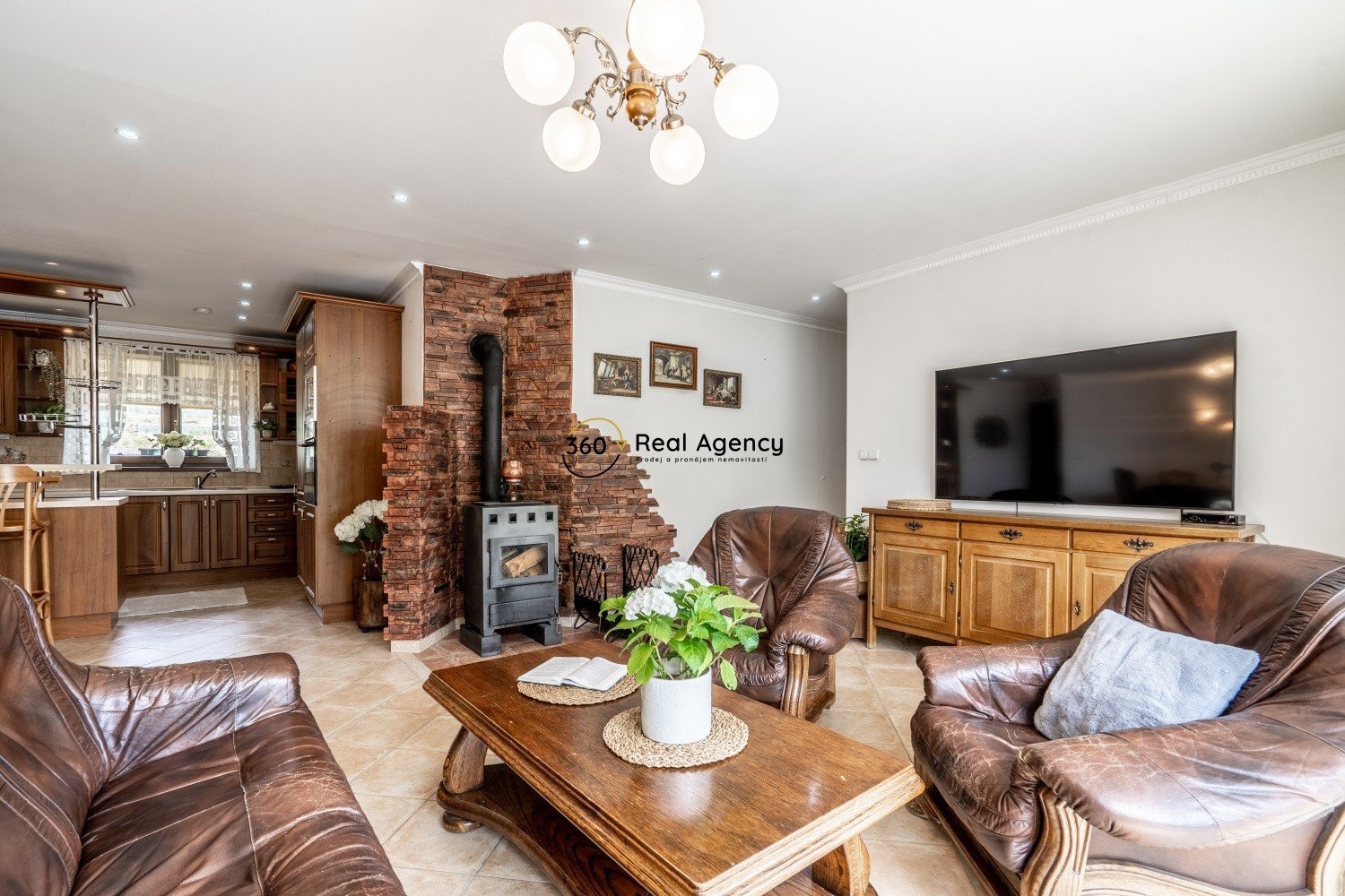 Dominantou domu je velkorysý obývací pokoj propojený s jídelní částí a kuchyňským koutem s praktickou komorou. O útulnou atmosféru se starají krbová kamna, výhled do zahrady a přímý vstup na terasu.