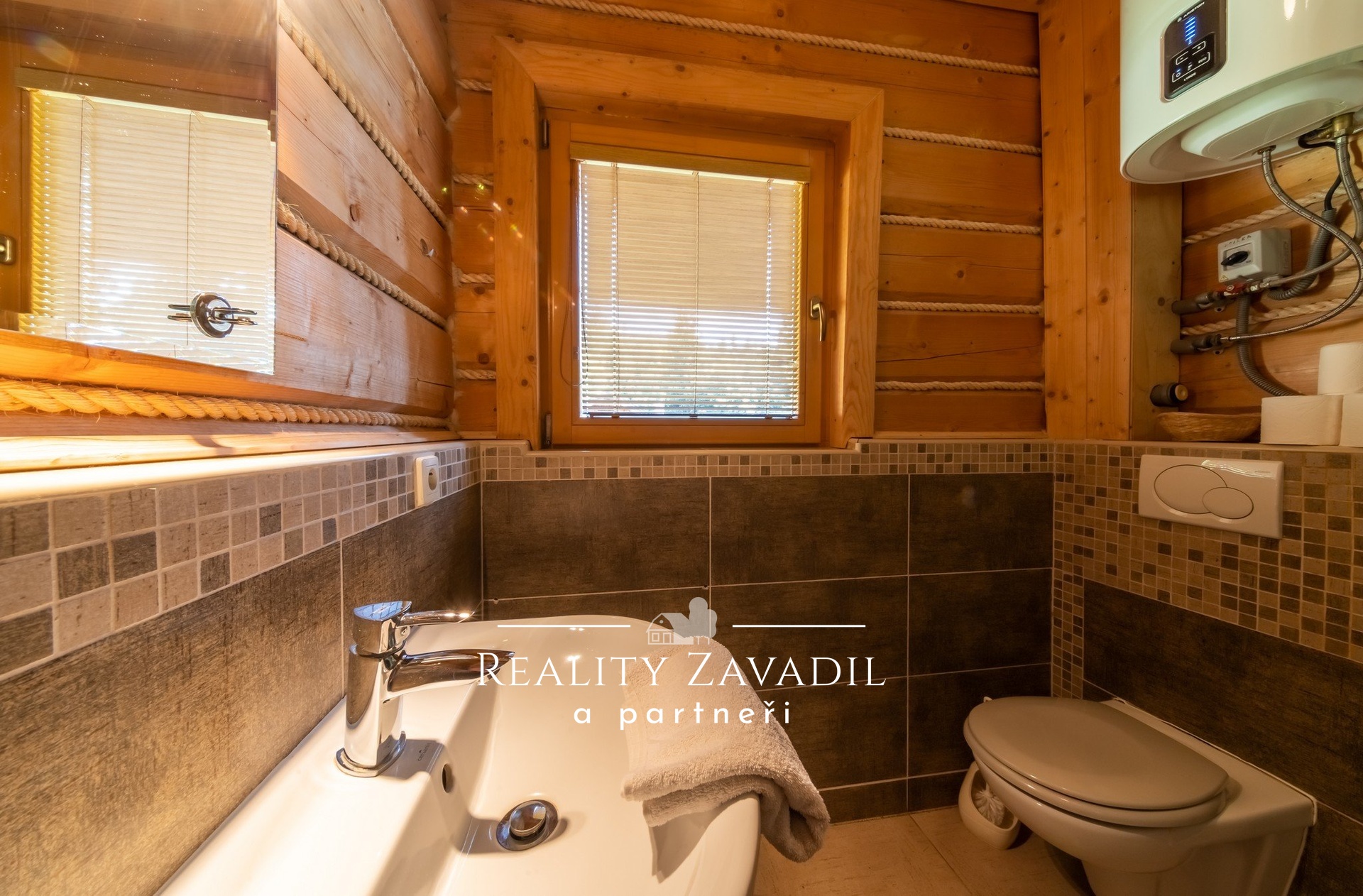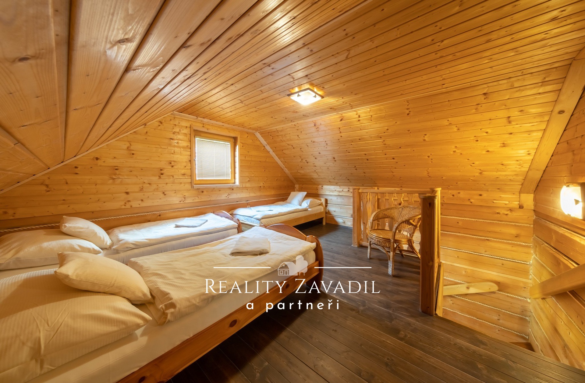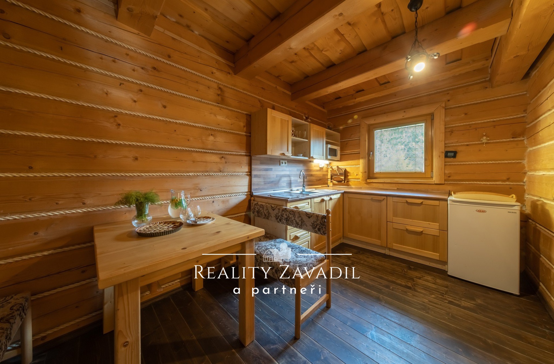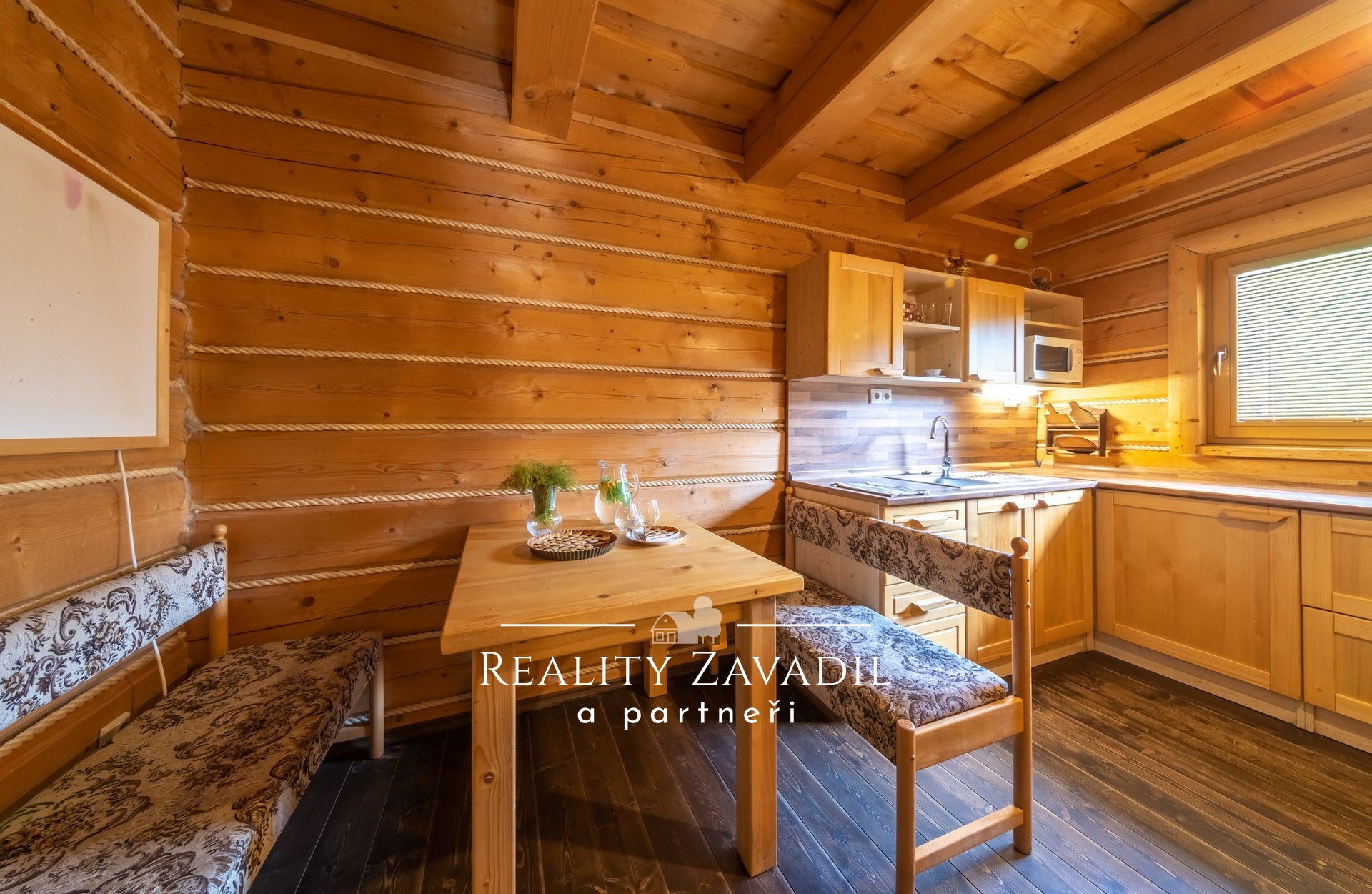 Klasická srubová chalupa pro 12 osob, 3 ložnice s koupelnami s možností rozšířit o další 2 pokoje, samostatná kuchyň, obývák s kachlovými kamny.