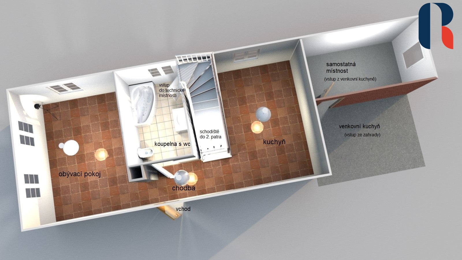 Patrový dům s podlahovou plochou 120 m² je dispozičně řešen jako 3+1. V dolním patře je chodba, obývací pokoj, kuchyň, technická místnost, koupelna s wc a vanou. V horním patře nad schodištěm se nachází chodba, wc, dva samostatné pokoje a šatna.