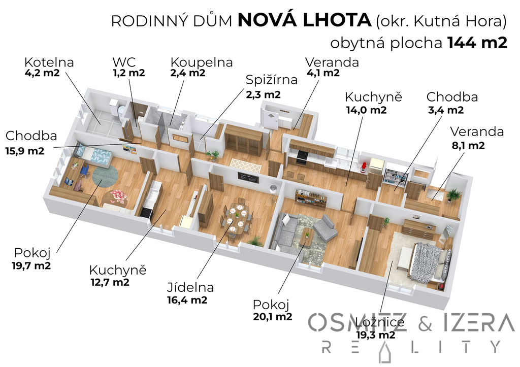Dům má užitnou plochou 144 m², což zaručuje dostatek místa pro všechny členy domácnosti i návštěvy. Zastavěná plocha činí 157 m² a celková plocha pozemku je 1496 m², což poskytuje dostatek prostoru pro zahradní úpravy, zahradničení či relaxaci.