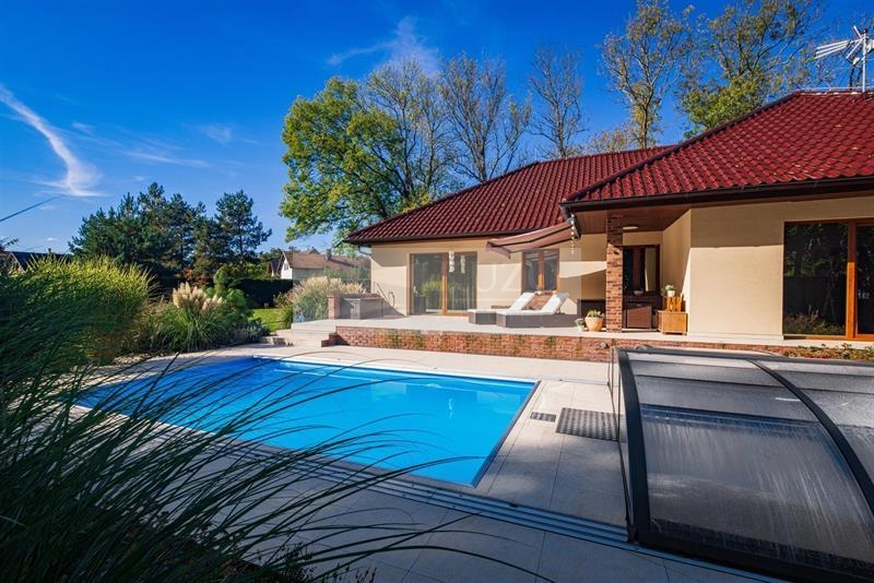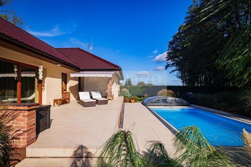 Exklusivně vám nabízíme novostavbu rodinného domu z r. 2017 - bungalov o dispozici 5+kk, se zahradou v klidné části malé obce Koprník, vzdálené 10 km od města Mladá Boleslav. Umístění domu je na úplném okraji obce bez sousedů. Dominantou této nabídky je pozemek o velikosti 2.485 m2 ( včetně domu 2.769 m2) se vzrostlou zahradou, zajišťující naprostý pocit soukromí a příjemné relaxace s letním posezením a místem pro grilování. Vedle terasy domu je umístěn zastřešený bazén se slanou vodou 6 x 3,5 m2 a vlastním tepelným čerpadlem.