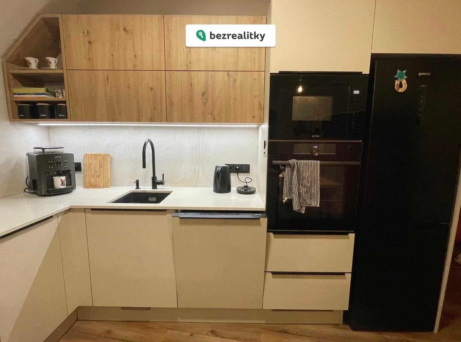 Součástí prodeje je luxusní kuchyňská linka s pracovní deskou Technistone (stejný materiál je i v koupelně a na parapetech), vestavěné skříně, jídelní i pracovní stůl včetně skříní, kompletní obývací stěna a úložné prostory v předsíni i koupelně.