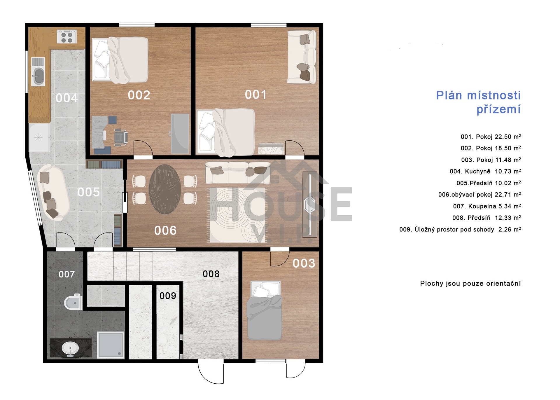 • Spodní patro – prostorné rodinné bydlení s podlahovým vytápěním vodou a koupelnou s elektrickým podlahovým vytápěním.
