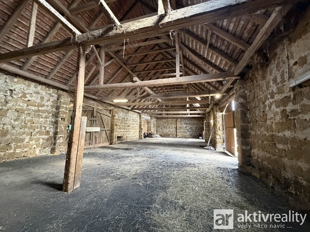 Naproti obytné části se nacházejí dvě hospodářské budovy – menší a větší chlévy, které jsou v dobrém technickém stavu. Větší chlév má přibližně 320 m², menší okolo 35 m². Obě stavby mají pevné zdivo, jsou suché a stabilní, a nad nimi se rozkládá rozsáhlý půdní prostor vhodný pro skladování nebo další využití. Na stodolu dále navazuje vysoký otevřený přístřešek o ploše přibližně 122 m², který nabízí další prostor například pro techniku či materiál.