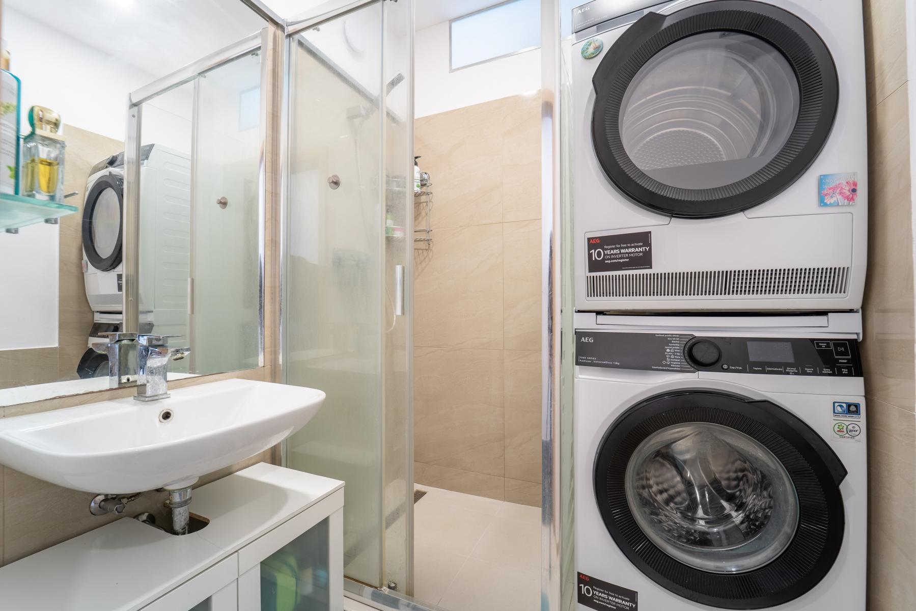 Dominantou bytu je moderní kuchyňská linka vyrobená na míru, vybavená kvalitními a moderními spotřebiči. Koupelna disponuje sprchovým koutem, koupelnovou skříňkou se zrcadlem a praktickým prostorem pro pračku i sušičku. Toaleta je samostatná.
