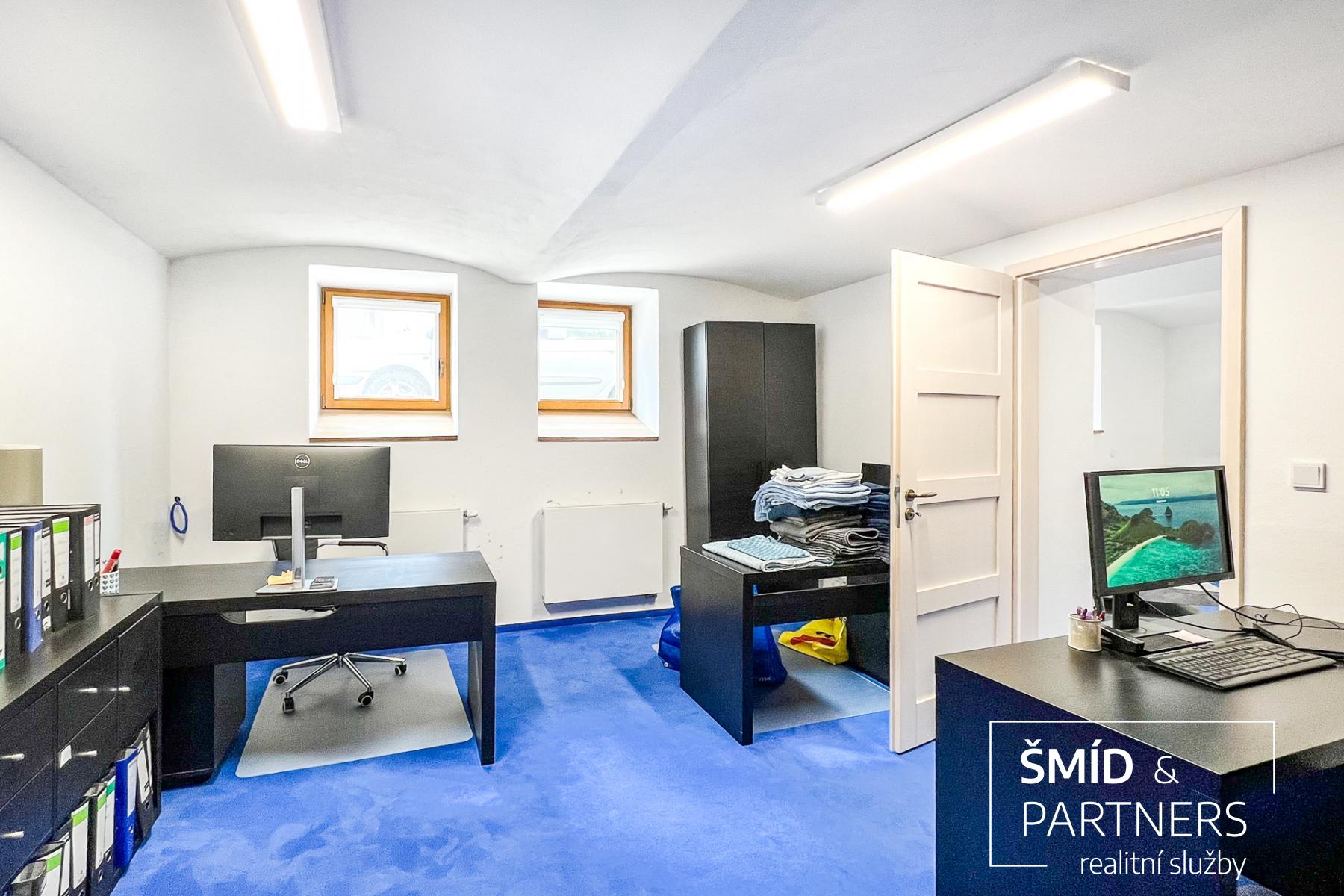 Kanceláře se nacházejí ve sníženém podlaží, a dvě z nich, které jsou směřované na zahradu, mají místo oken balkónové dveře. Velice praktická je průchodnost třech místností. Při vstupu první místnost po pravé straně funguje jako recepce a má k dispozici kuchyňku. Ponechání nábytku je o dohodě mezi současným a novým majitelem.
