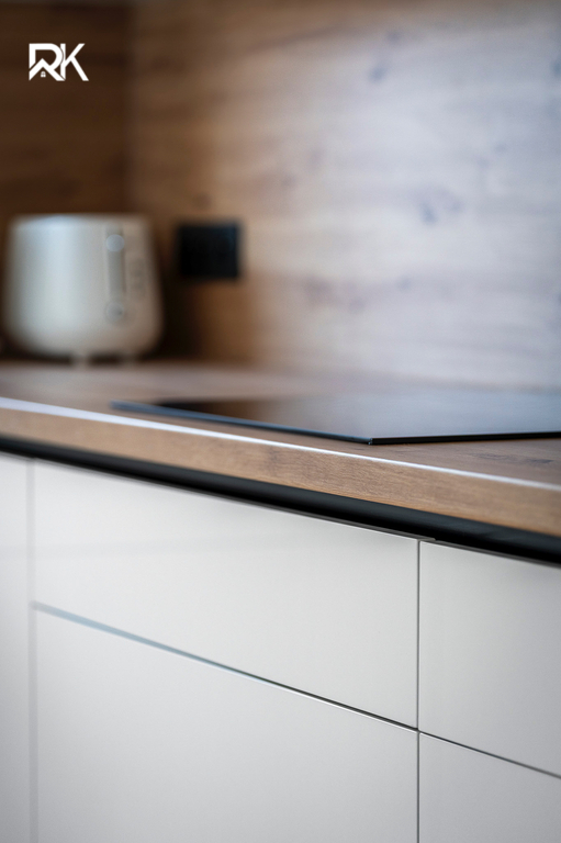 Kuchyňská linka s vestavnými spotřebiči Siemens (trouba, varná deska, myčka, lednice).