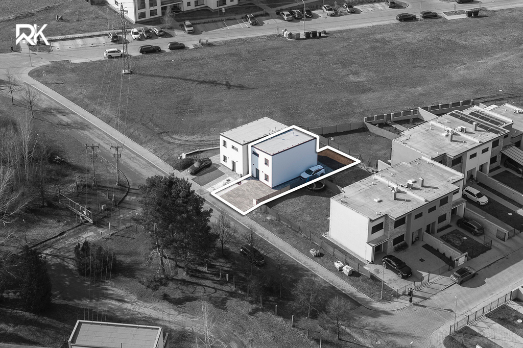 Zahrada se zpevněnými plochami z velkoformátové dlažby a venkovním nemrznoucím kohoutem. K domu náleží dvě vlastní parkovací stání přímo před vstupem.