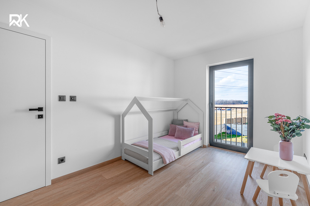 Patro (2. NP): Centrální chodba, ložnice, dětský pokoj, samostatná prádelna s pračkou a sušičkou a prostorná koupelna. Ta disponuje volně stojící vanou a velkoformátovou dlažbou (vybavení v hodnotě 250 000 Kč).