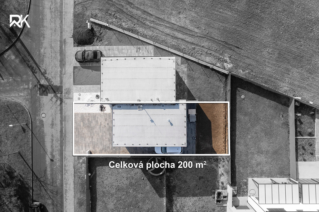 Zahrada se zpevněnými plochami z velkoformátové dlažby a venkovním nemrznoucím kohoutem. K domu náleží dvě vlastní parkovací stání přímo před vstupem.