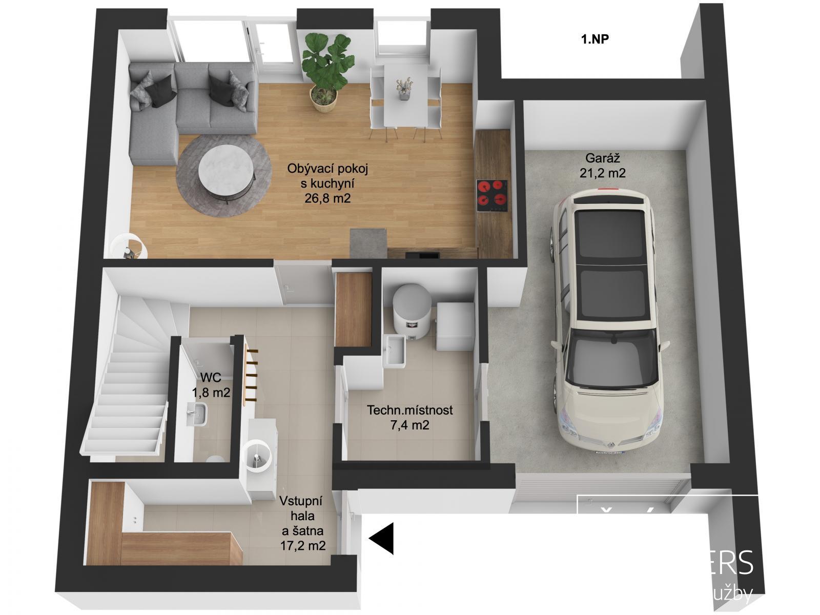 - Prostorná garáž s bránou pouze pro majitele a dvě parkovací místa před domem