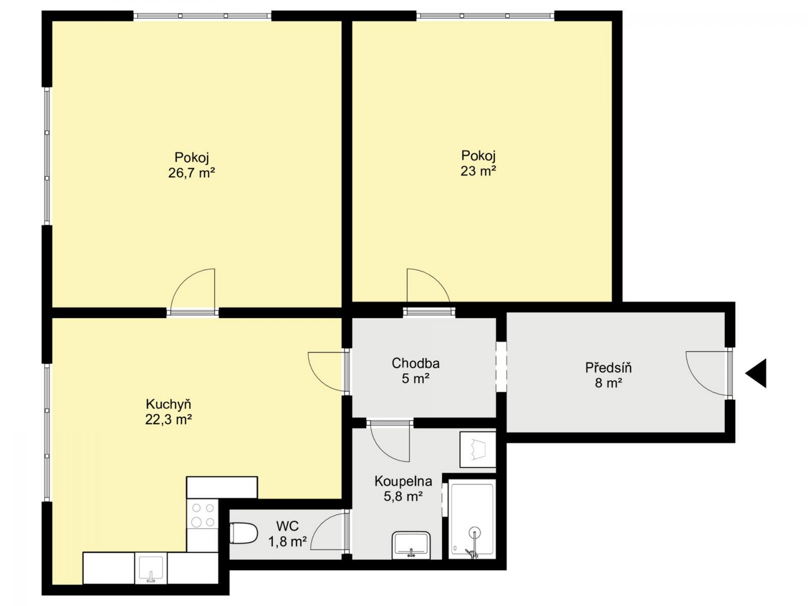 Bytová jednotka nabízí dvě samostatné ložnice, obývací pokoj s kuchyňským koutem, koupelnu s velkým sprchovým koutem, oddělené WC.