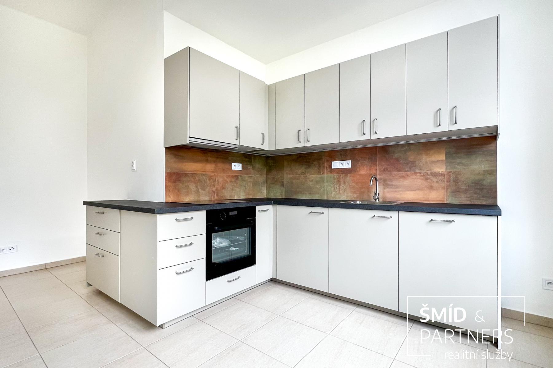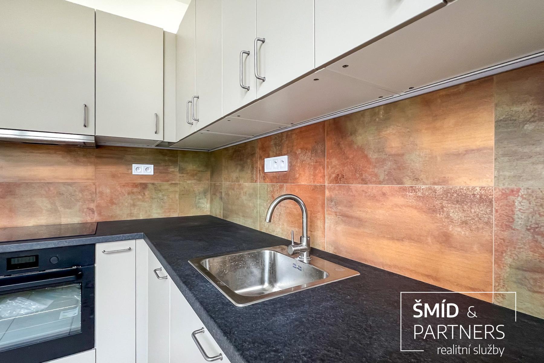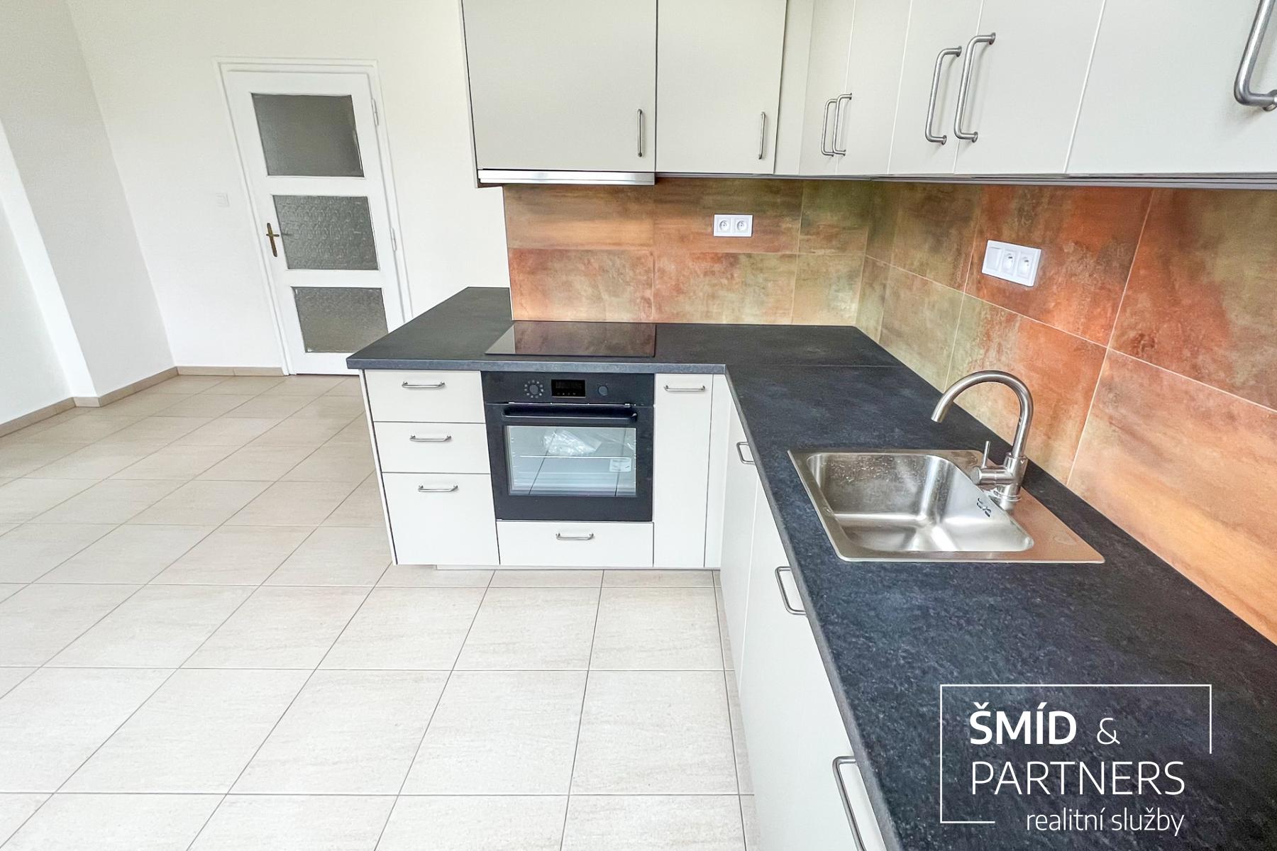 Kuchyňský kout je vybavený kuchyňskou linkou, myčkou nádobí, horkovzdušnou troubou, indukční varnou deskou a digestoří.