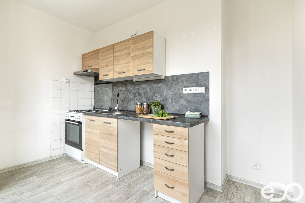 Byt má praktické a funkční uspořádání. Obývací pokoj je průchozí do kuchyně, čímž vzniká přirozený denní prostor. Kuchyně je vybavena kuchyňskou linkou a sporákem.