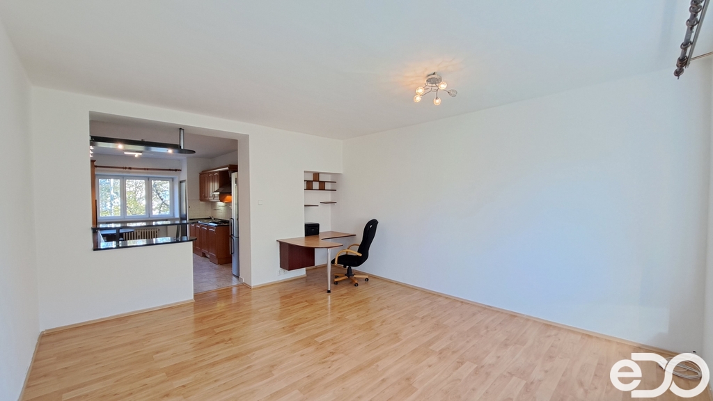 Obývací pokoj je plynule propojen s kuchyňskou částí – mezi místnostmi nejsou dveře, ale široký průchod. Kuchyň je od obývacího pokoje opticky oddělena barem navazujícím na kuchyňskou linku, který může sloužit jako jídelní, pracovní i odkládací plocha. Kuchyňská část je orientována na severovýchod a je vybavena kuchyňskou linkou, sporákem, troubou, pračkou a praktickou spíží.
