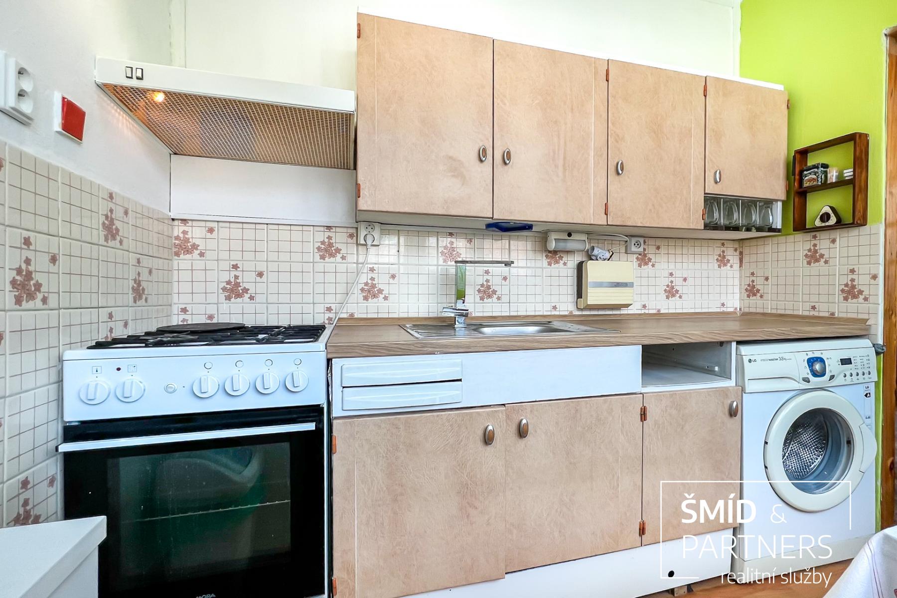 Kuchyně je vybavena elektrickou troubou a plynovým sporákem, digestoří, mikrovnou troubou, je zde umístěna pračka.
