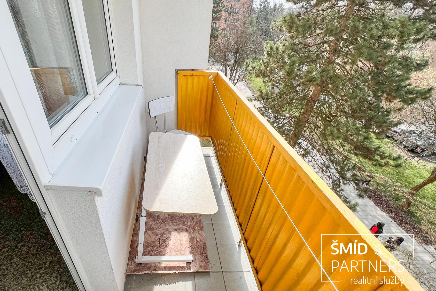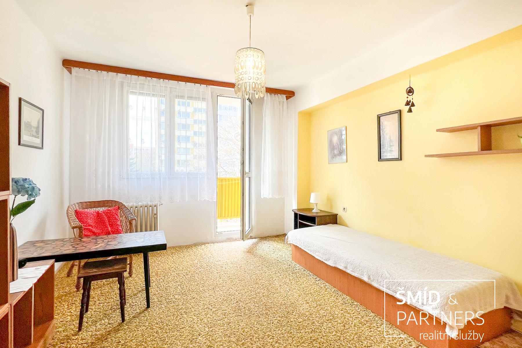 Byt disponuje samostatnou ložnicí s přístupem na balkon, prostorným obývacím pokojem, kuchyní, samostatnou koupelnou a WC. Koupelna s WC prošly renovací, je zde umístěna vana se zástěnou, umyvadlová skřínka se zrcadlem, zbývající části bytu jsou původní.