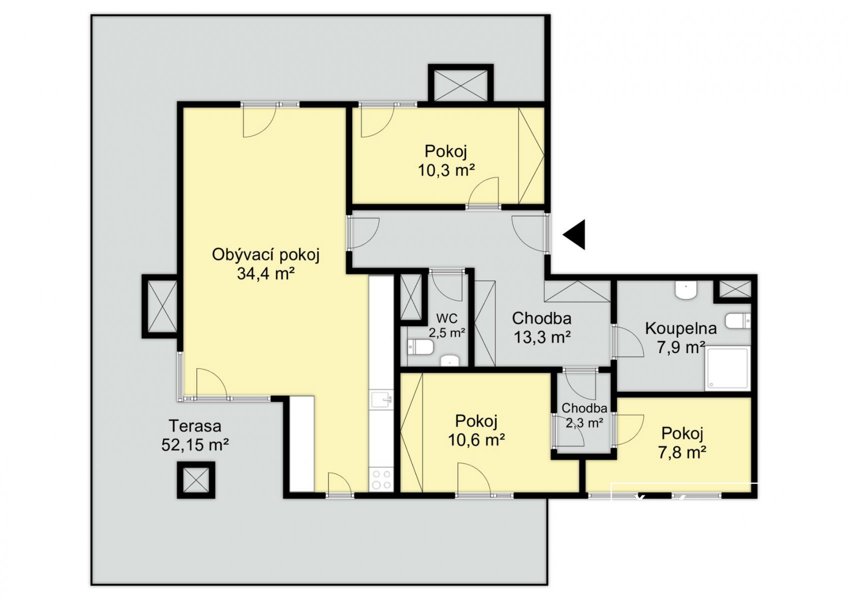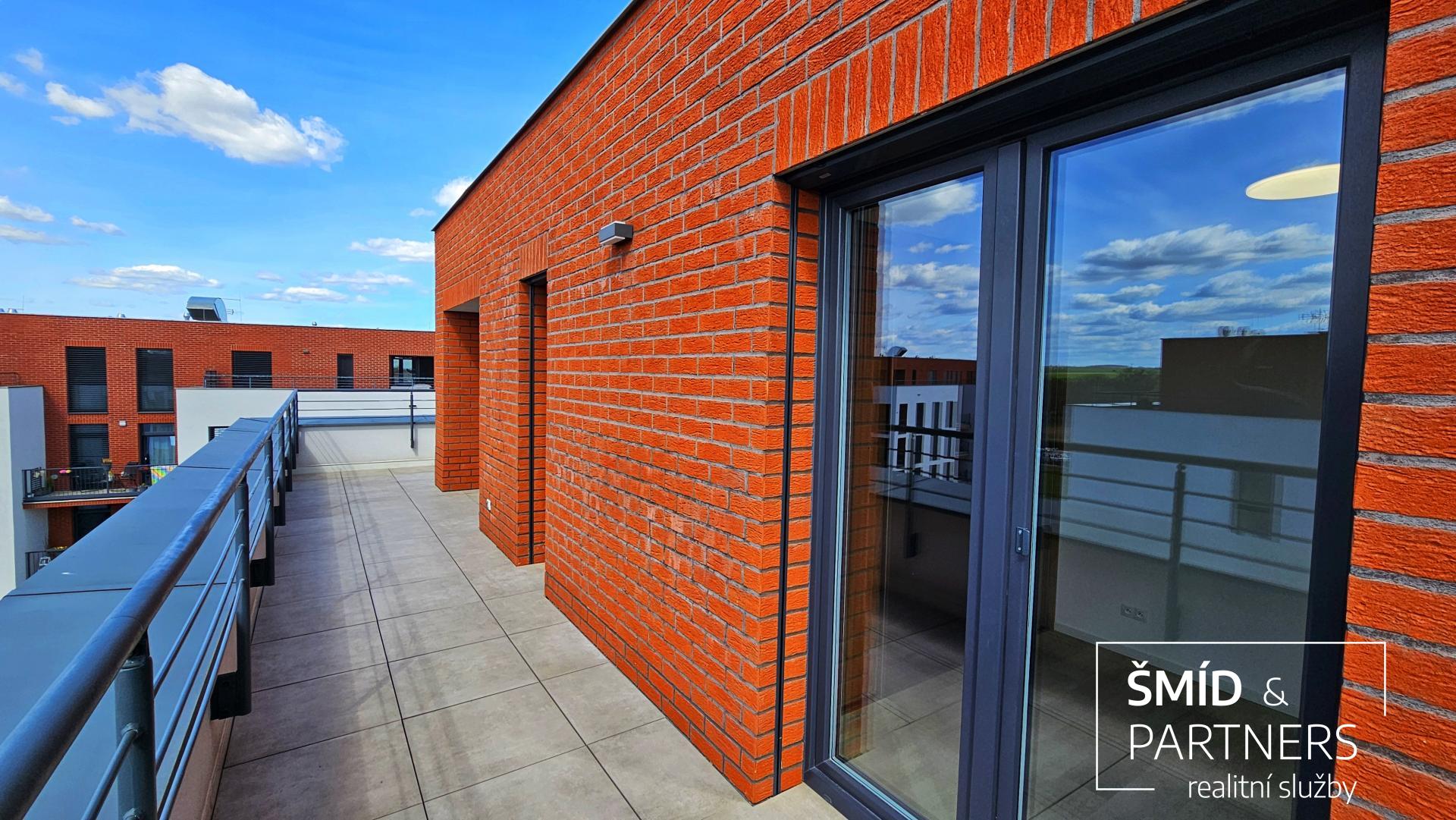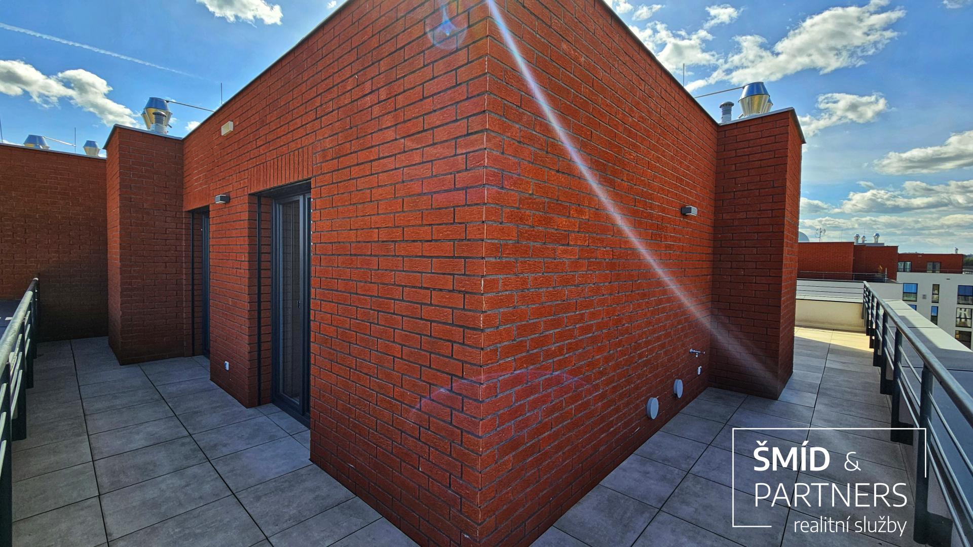 Dominantou tohoto bytu je střešní terasa o velikosti 52 m and sup2;, která obepíná celý byt ze tří stran a je přístupná ze tří ze čtyř pokojů. Jedná se o ideální místo pro relaxaci a odpočinek. Terasa disponuje elektrickými zásuvkami, nezámrzným kohoutem a krytou částí přístupnou přímo z obývacího pokoje s kuchyní, která poskytuje perfektní místo pro venkovní posezení. K bytu také náleží dvě prostorná parkovací místa v podzemní garáži a sklepní kóje.