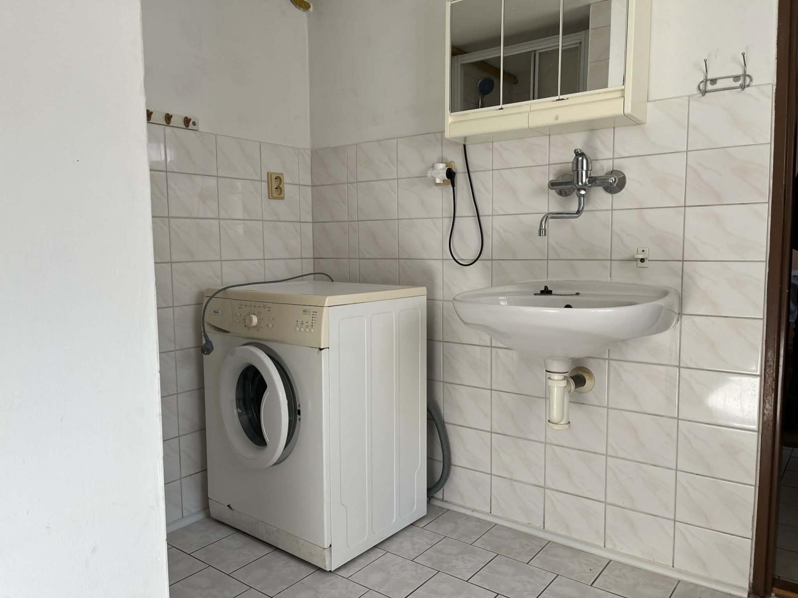 Nemovitost je starší, ale plně funkční a zařízená. K dispozici je kuchyňská linka včetně spotřebičů (lednice, mikrovlnná trouba), pračka, jídelní stůl se dvěma židlemi, konferenční stolek, křeslo a úložné skříně.