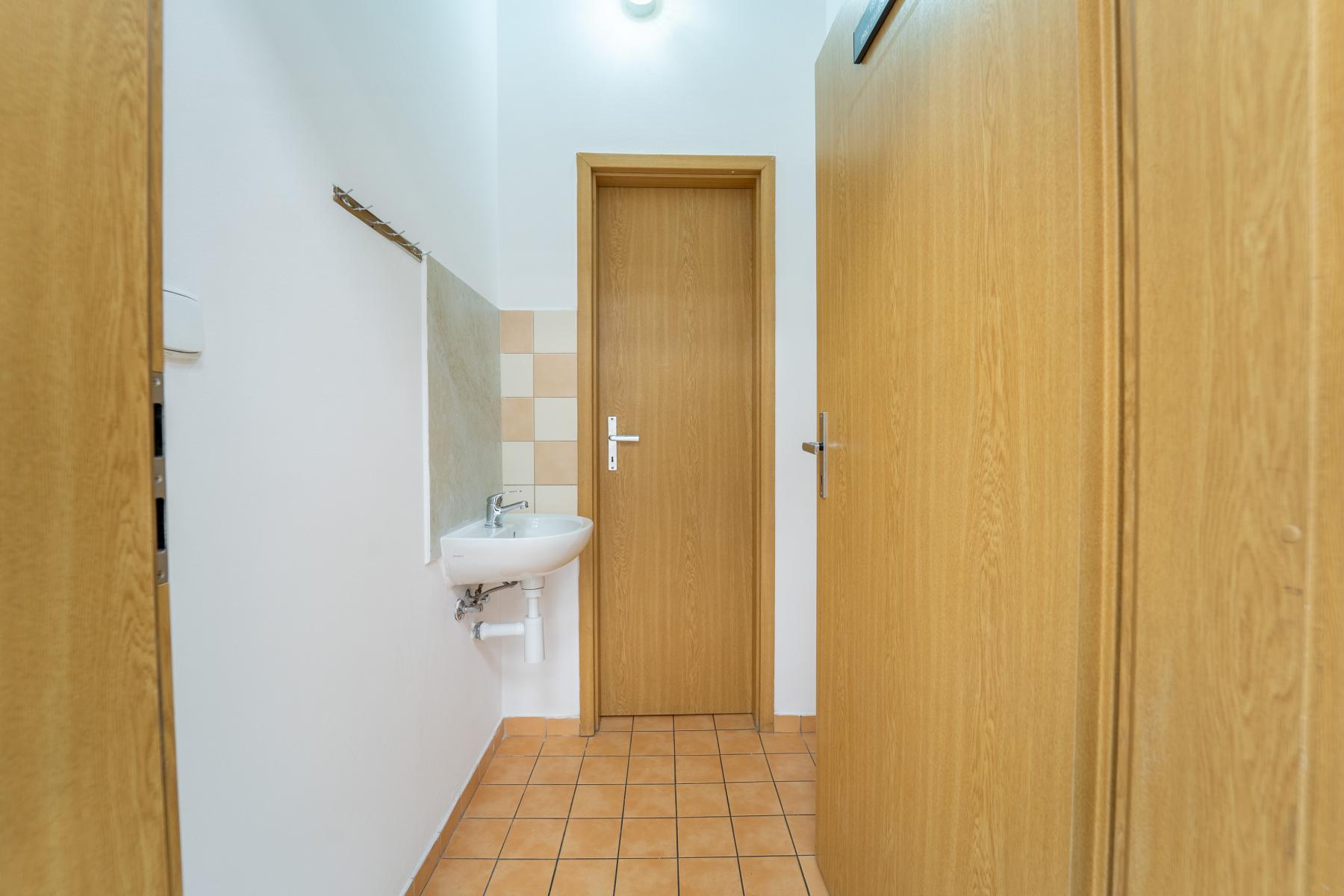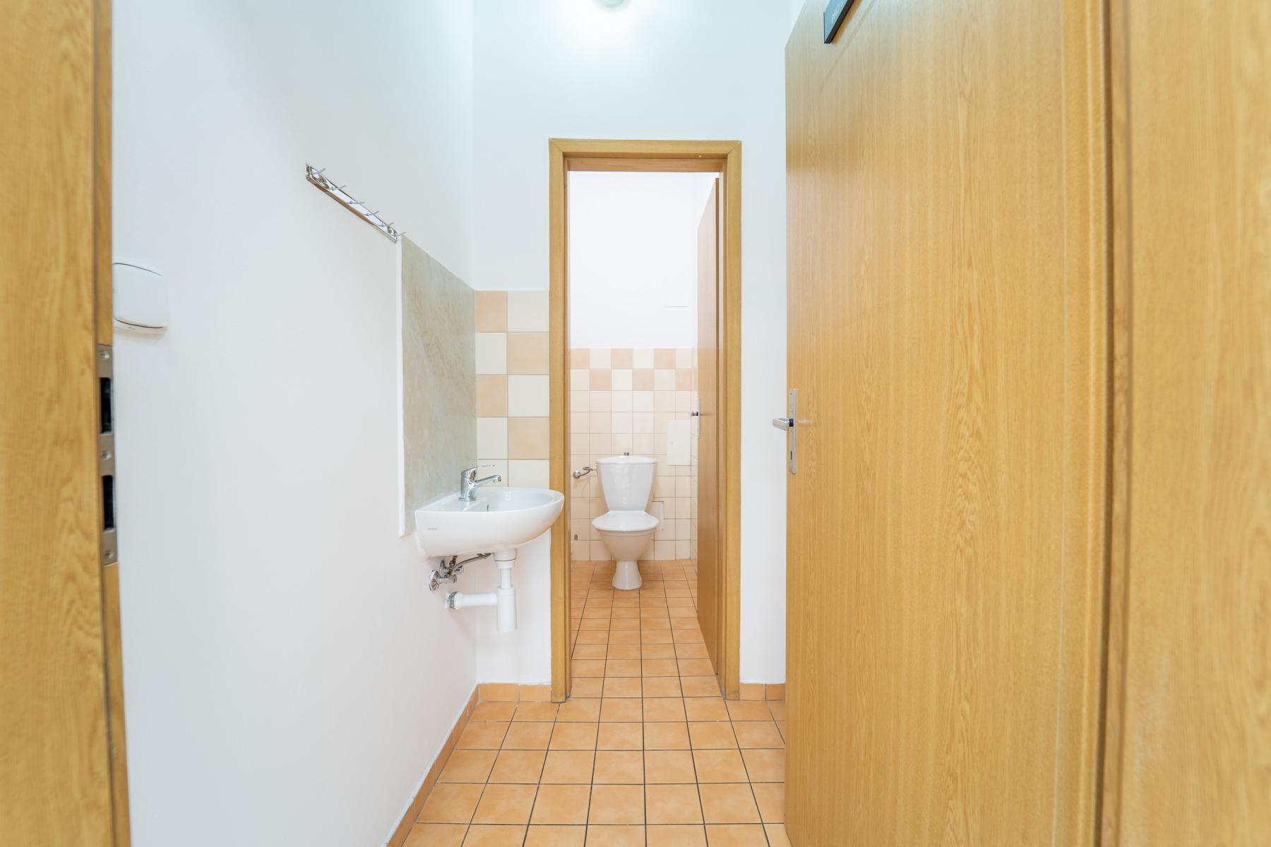 Dispozičně je prostor velmi prakticky řešen. Dominantou je velká hlavní místnost vhodná jako open space kancelář pro několik pracovních míst. Dále je k dispozici samostatná menší místnost, která se nabízí jako zasedací místnost nebo klidná kancelář pro vedení. Součástí je také kuchyňka a vlastní toaleta. V domě je navíc možné využívat další toalety, například pro klienty.