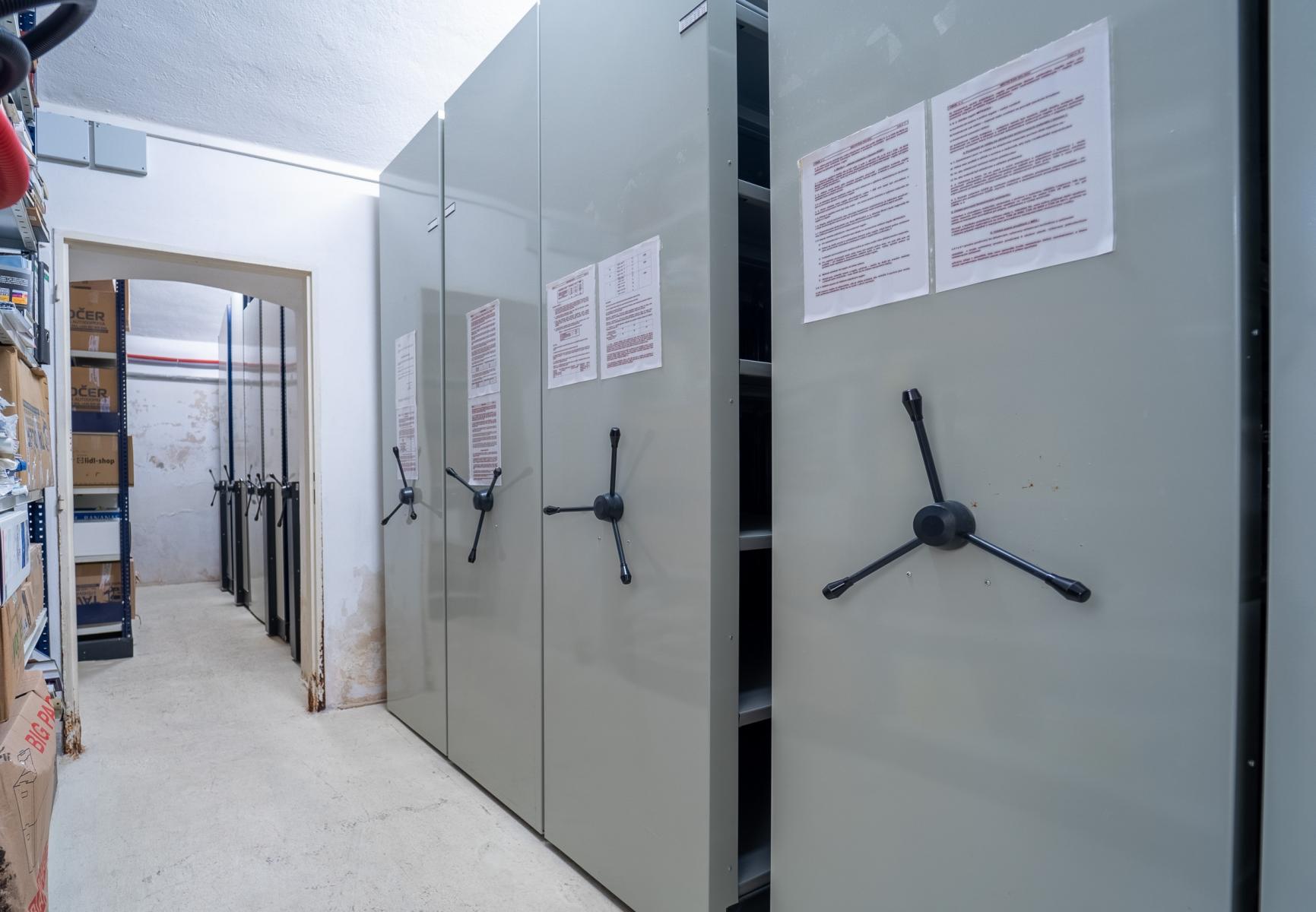 V případě potřeby je možné za příplatek pronajmout také skladové prostory ve sklepě, vhodné jako spisovna. Tyto prostory jsou vybaveny profesionálním regálovým systémem a cena bude stanovena individuálně dle rozsahu využití.