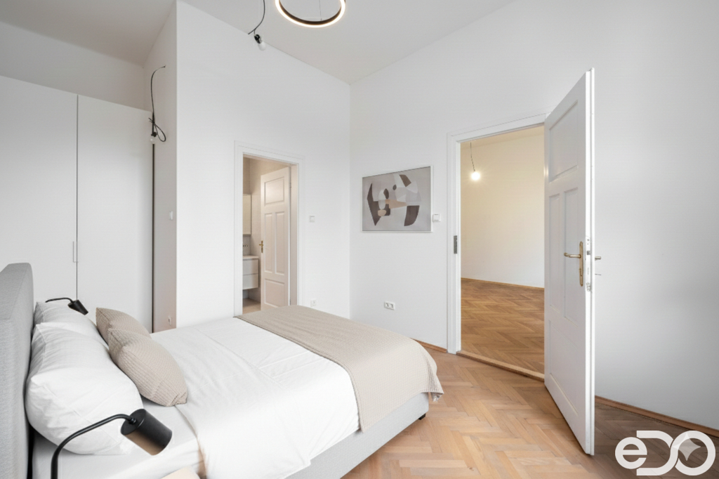 Byt prošel částečnou rekonstrukcí - rozvody včetně elektro. Interiér kombinuje zachované parkety s novějšími podlahami. Velká okna a vyšší stropy podtrhují charakter domu.