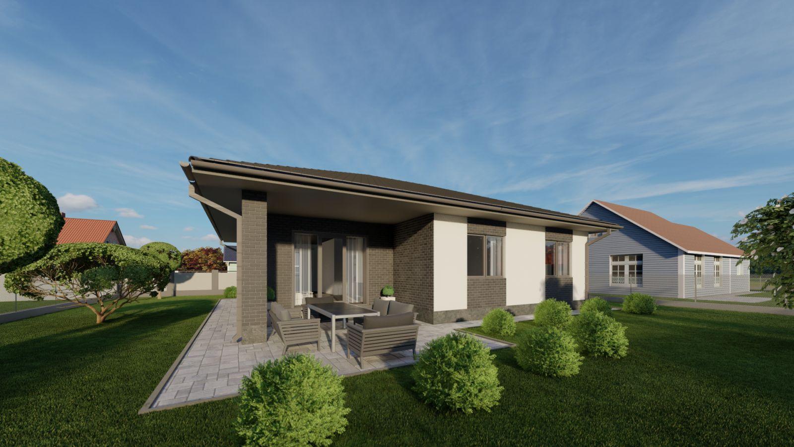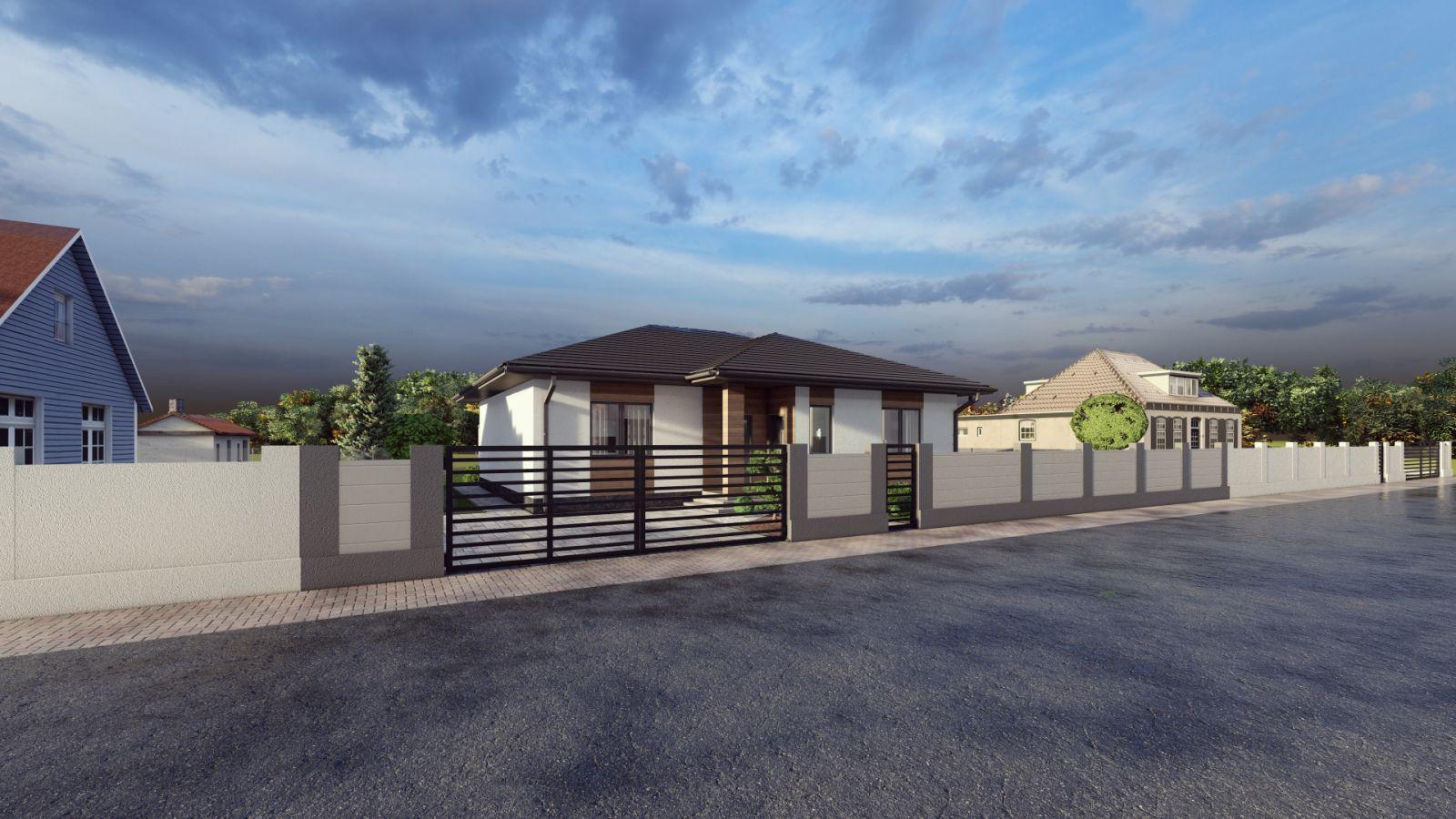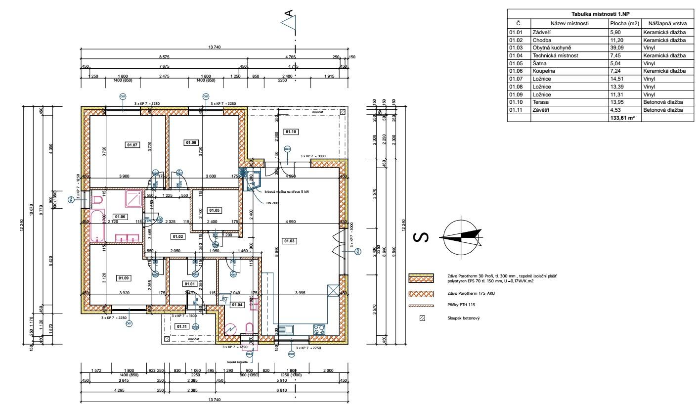 Dispozice domu je 4+kk a zahrnuje prostorný obývací pokoj s kuchyňským koutem a přímým vstupem na terasu a zahradu, tři samostatné pokoje, koupelnu s vanou i sprchovým koutem, samostatné WC, šatnu, technickou místnost a vstupní chodbu. Promyšlené řešení domu nabízí dostatek úložných prostor a pohodlí pro rodinné bydlení.