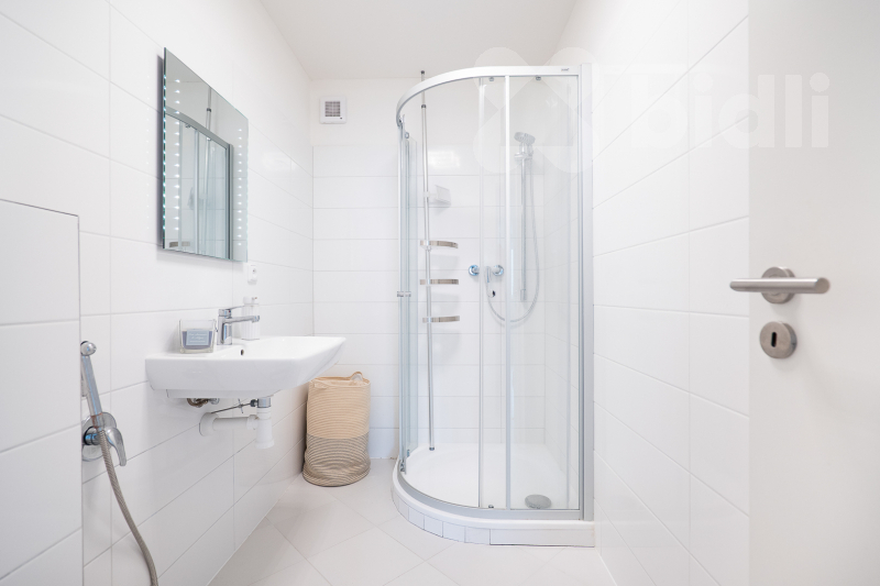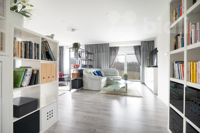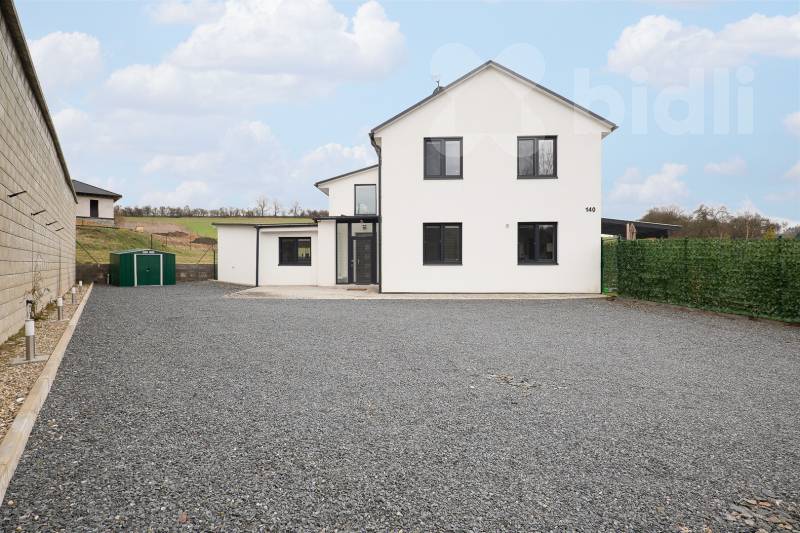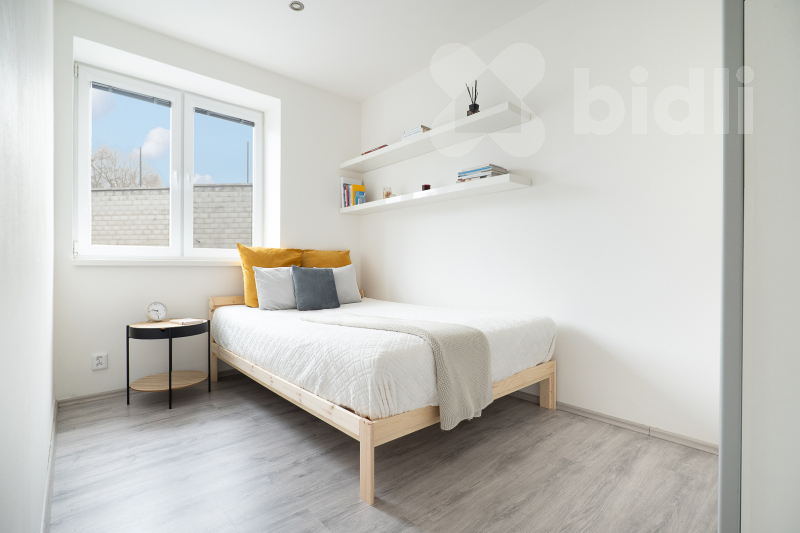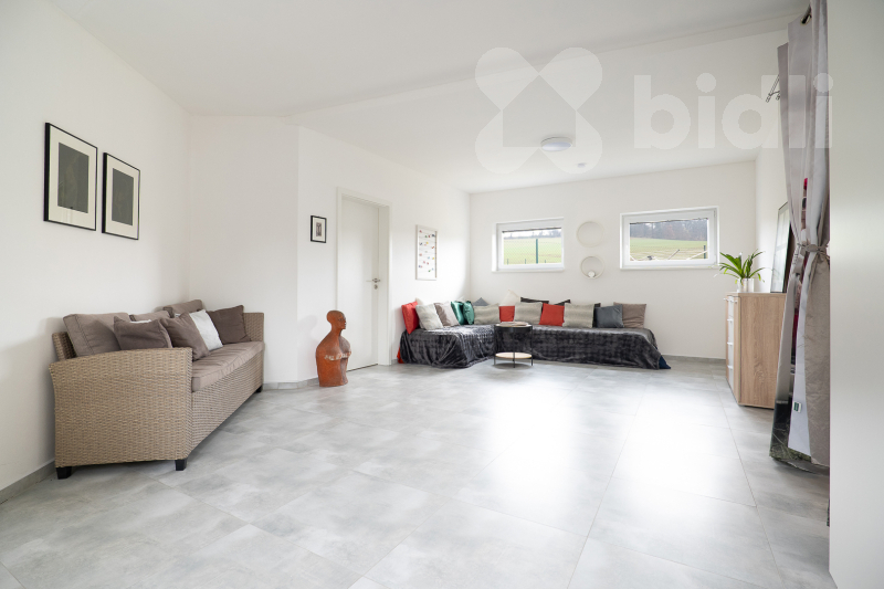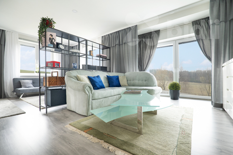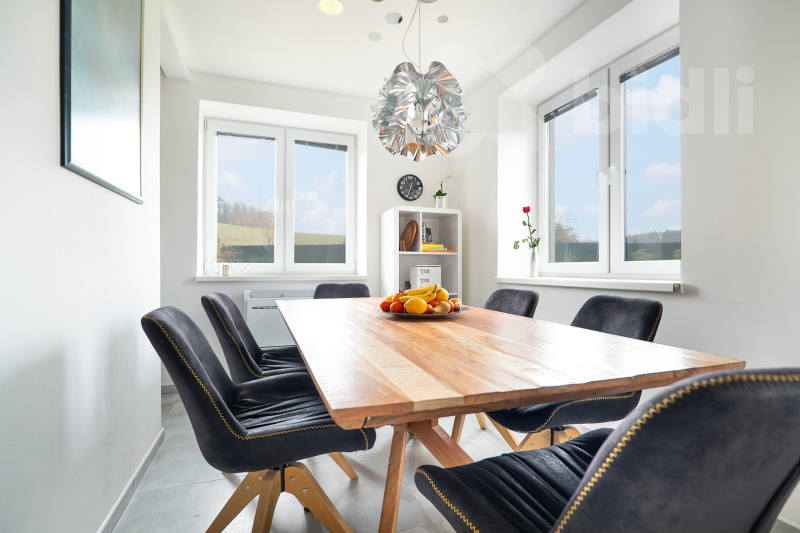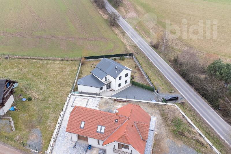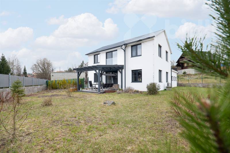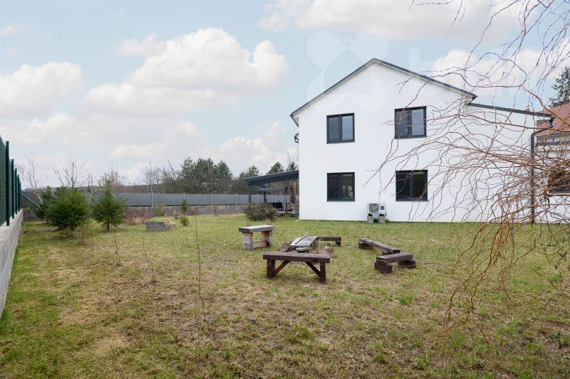 V 1. patře najdeme jednu velikou místnost (33 m2), kterou lze v případě potřeby rozdělit na víc pokojů, dále pak 1 pokoj a koupelnu s vanou, sprchovým koutem a WC. V celém domě je podlahové vytápění, ohřev vody - bojler, klimatizace. Okna jsou plastová s bezpečnostními foliemi a sítěmi proti hmyzu. Z přízemí přístupnou terasu s venkovním posezením zastřešuje pergola. K domu náleží vzrostlá, okrasná zahrada. Vedle budovy je k dispozici stání až pro 5 aut.