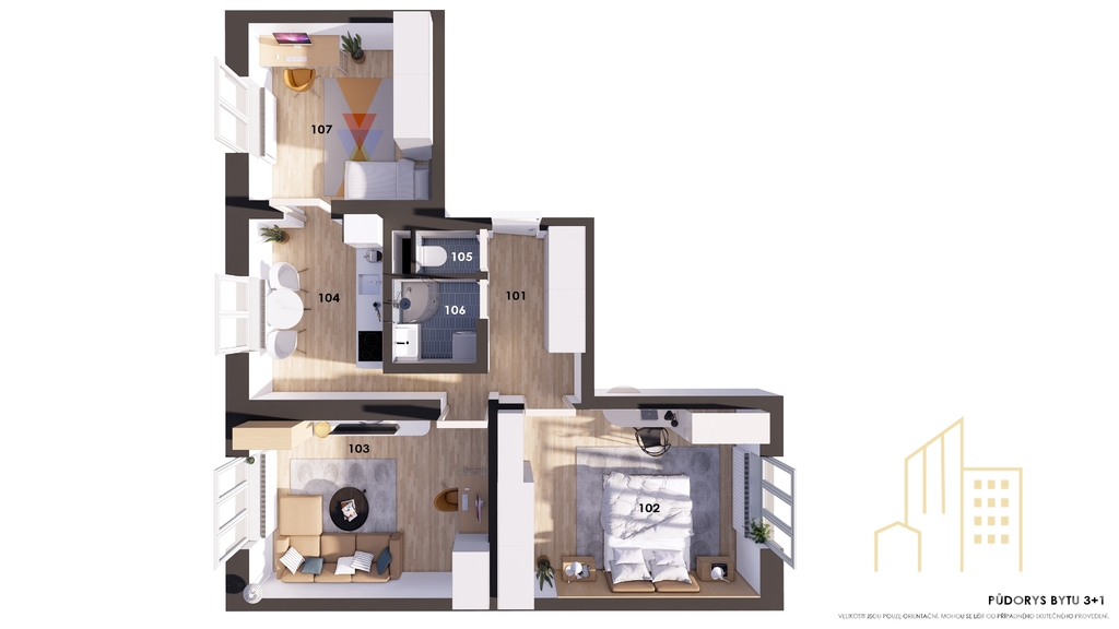 Dispozice bytu zahrnuje prostorný obývací pokoj, který je ideálním místem pro odpočinek a rodinná setkání. Dále se zde nachází dvě neprůchozí ložnice, což zajišťuje dostatek soukromí pro všechny obyvatelé. Kuchyň je vybavena potřebnými spotřebiči a nabízí příjemný prostor pro vaření i společné chvíle s rodinou.