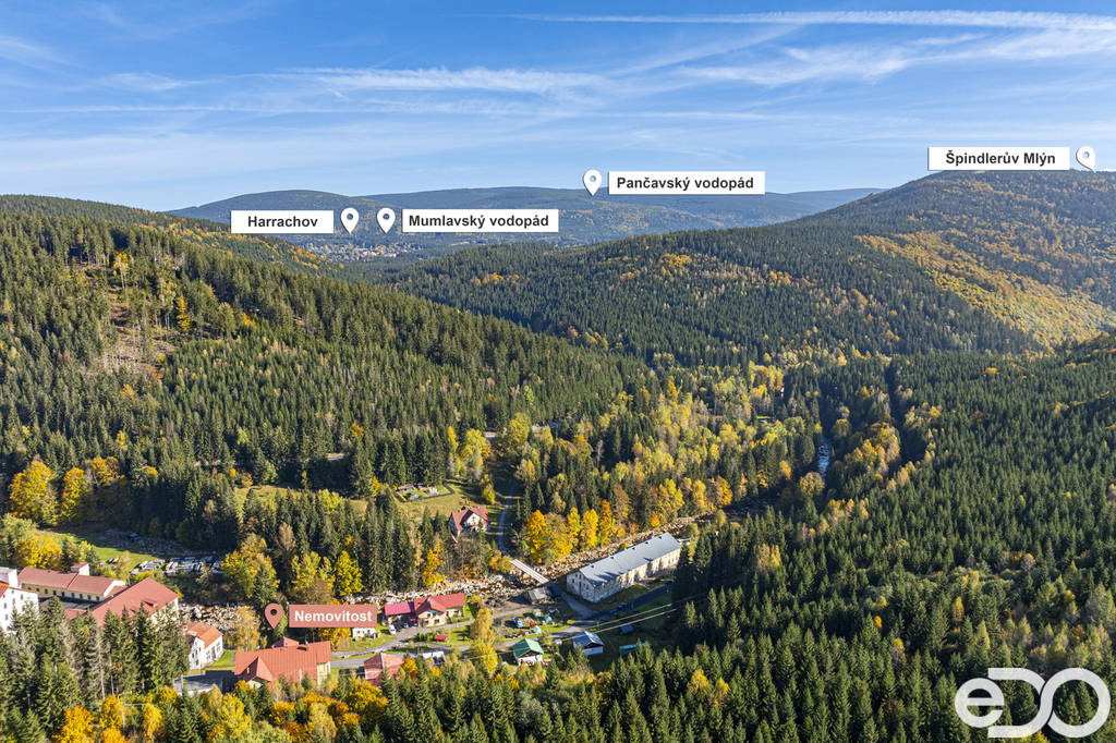 Lokalita nabízí klidné prostředí s dobrou dostupností – Tanvald (cca 9 km), Liberec (cca 35 km). V docházkové vzdálenosti je autobusová zastávka, vlaková stanice Horní Kořenov a pěší trasou přes les i zastávka Harrachov.