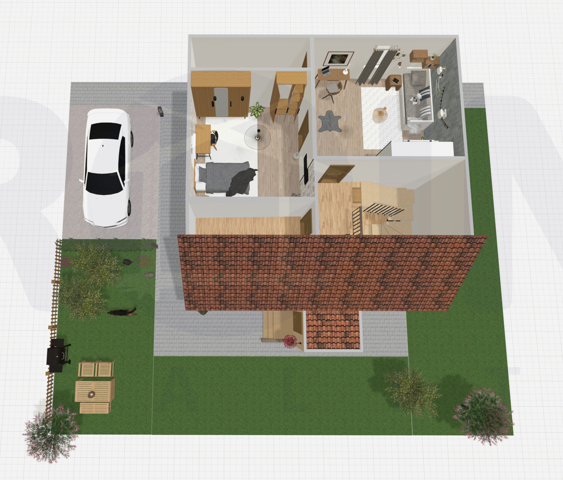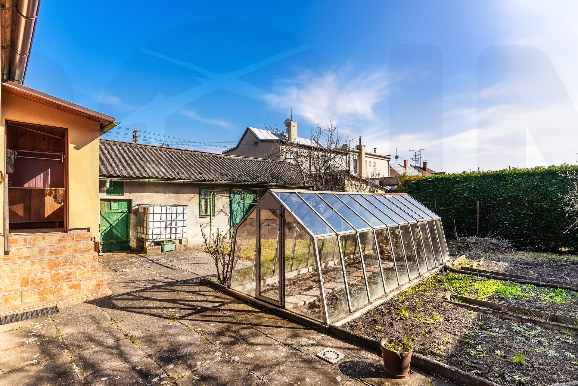 Zahrádka byla do minulého roku využívána spíše k pěstování zeleniny- je zde funkční skleník, ovocné stromy i dostatek záhonků. Pokud ale nepatříte mezi vášnivé zahradníky, samozřejmě je tu možnost realizace okrasné zahrady s pergolou a posezením a pokud budete chtít, zůstane zde určitě i místo pro bazén.