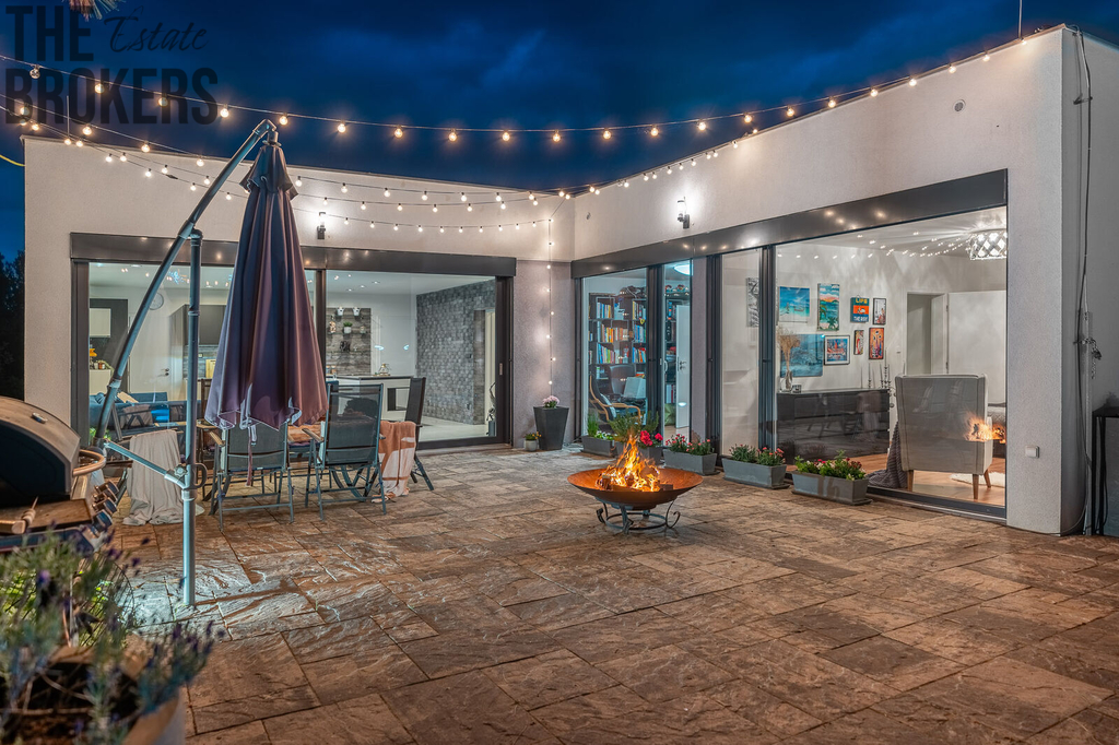Dům nabízí také množství vestavěných úložných prostor a je zařízen vkusně a funkčně. Osvětlení v domě je možné pohodlně ovládat prostřednictvím mobilního telefonu.