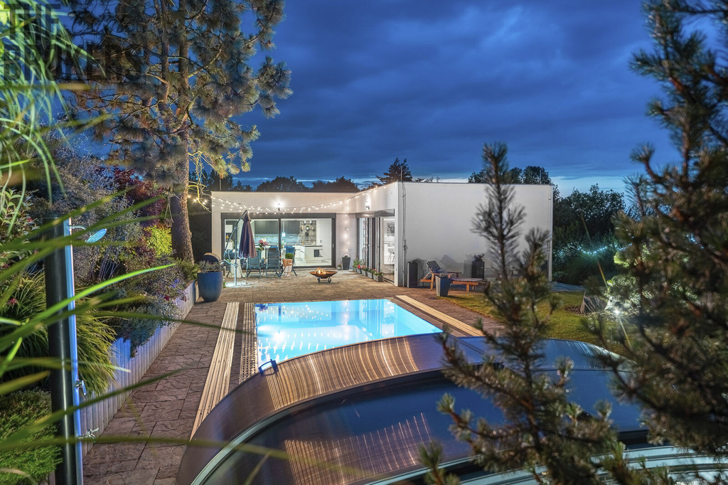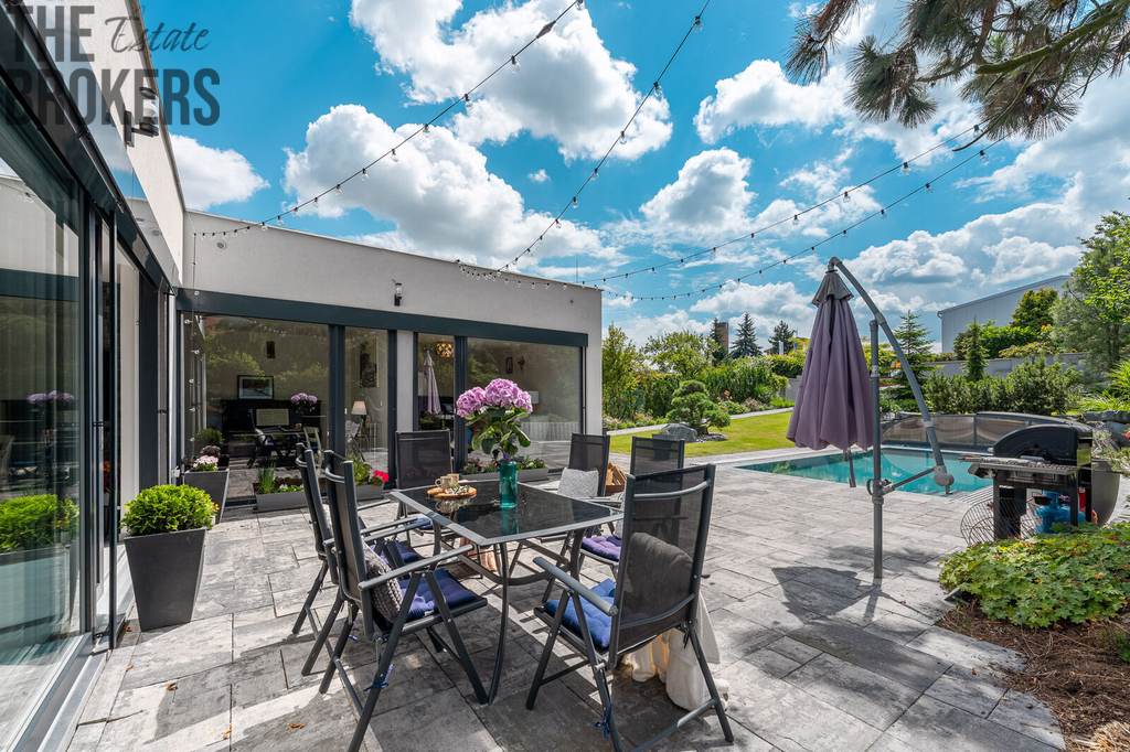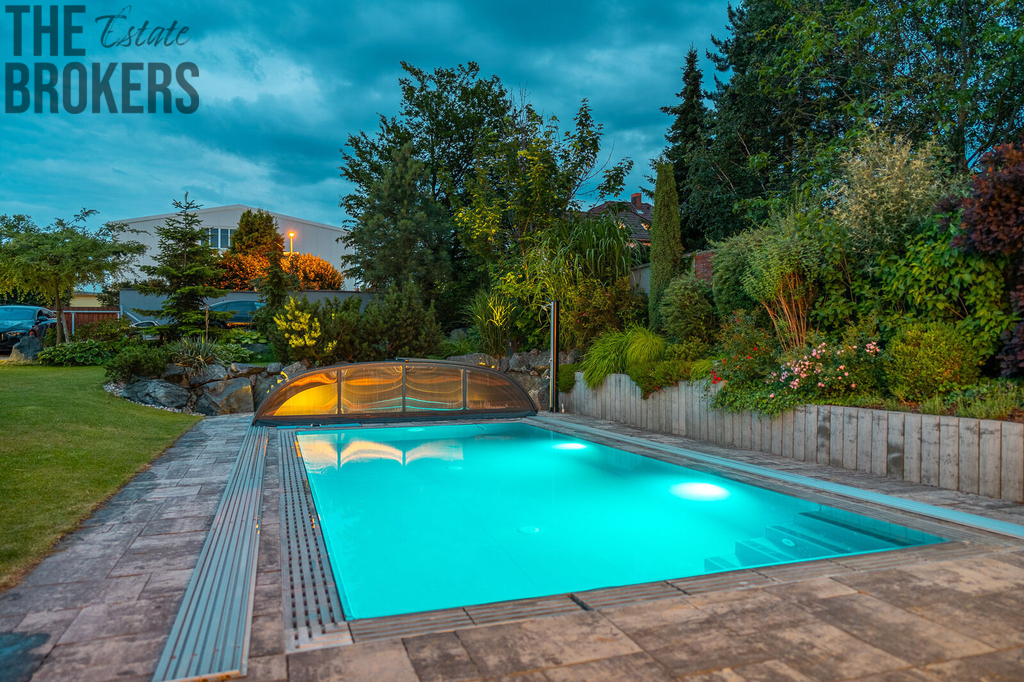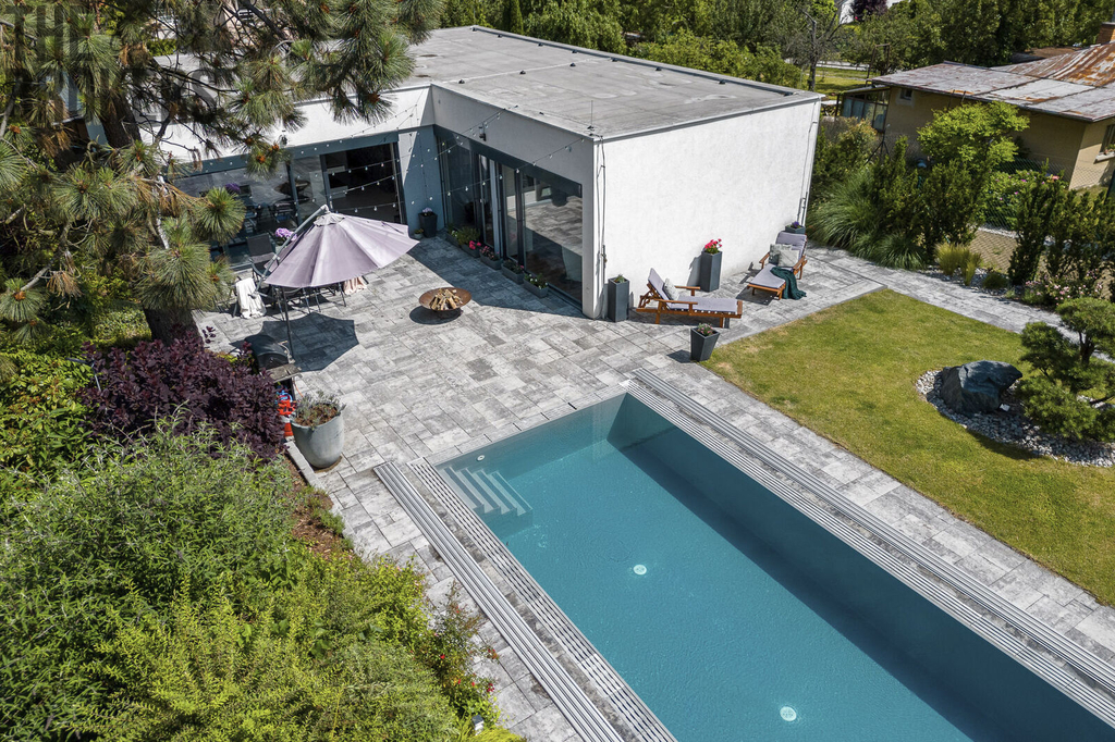 Dominantou zahrady je přelivový bazén, jehož hladina je v úrovni terasy. Bazén je vybaven tepelným čerpadlem pro vyhřívání, šedou fólií, protiproudem a moderním barevným LED osvětlením.
