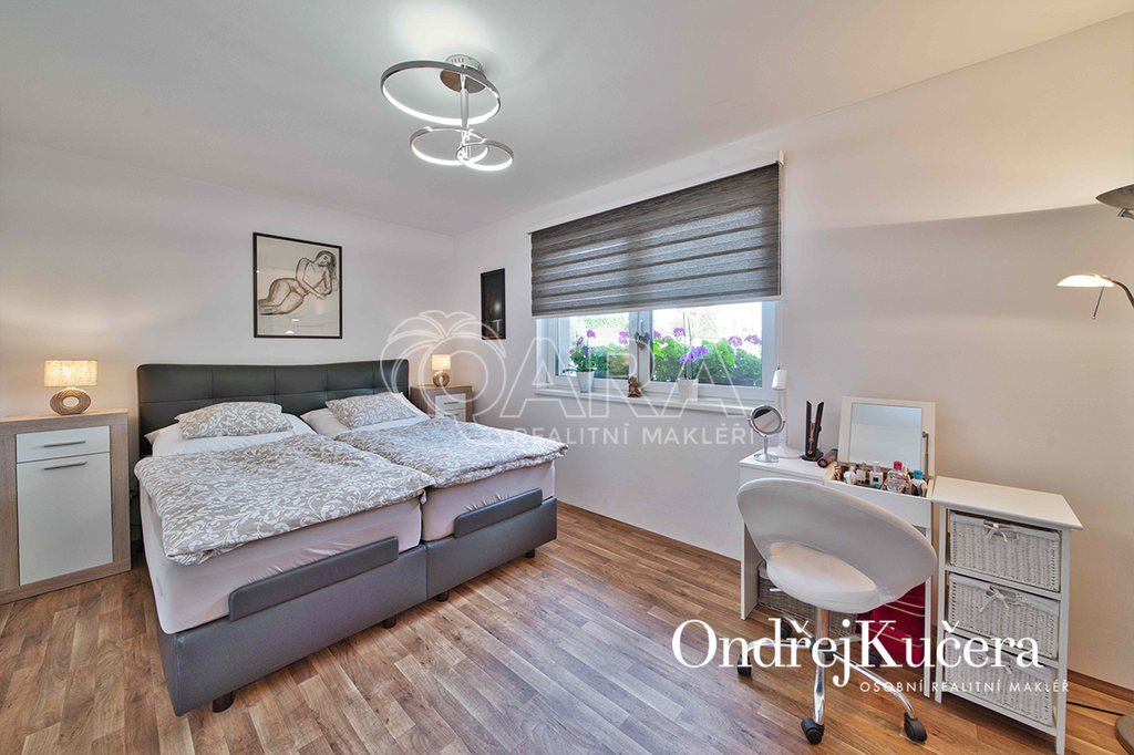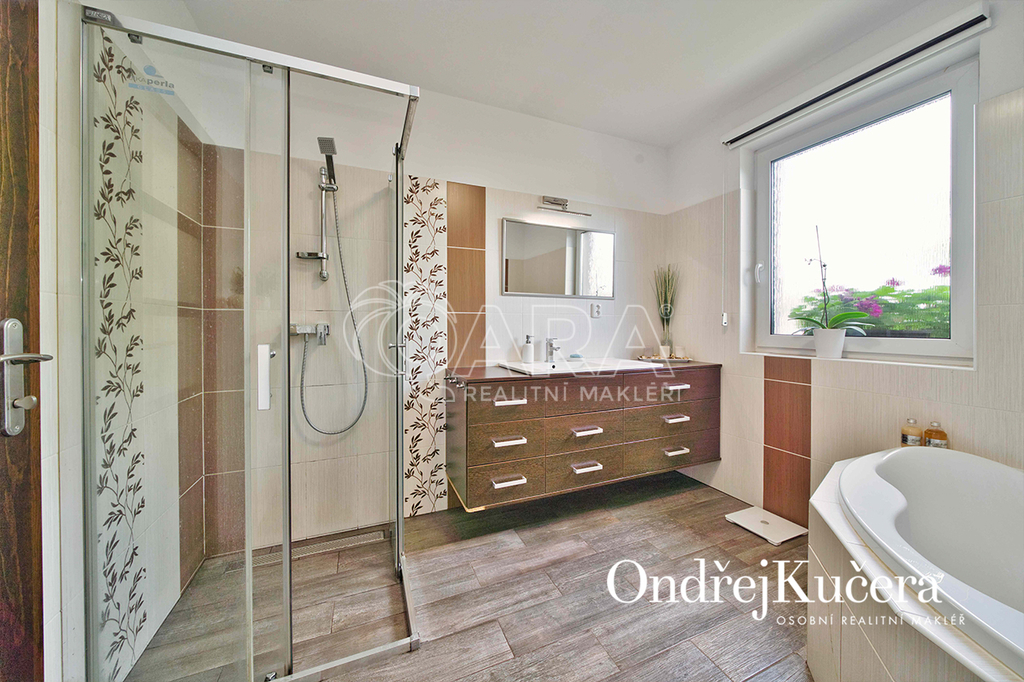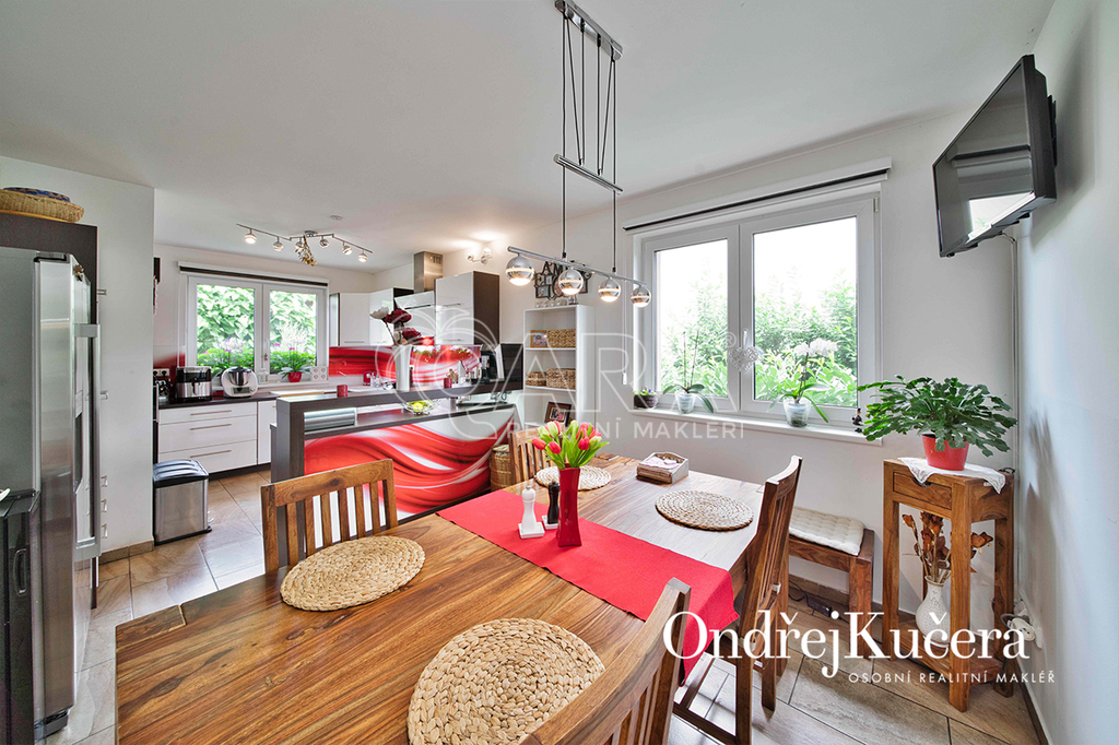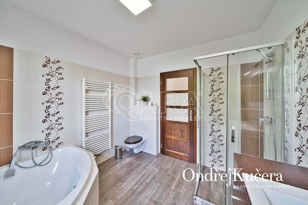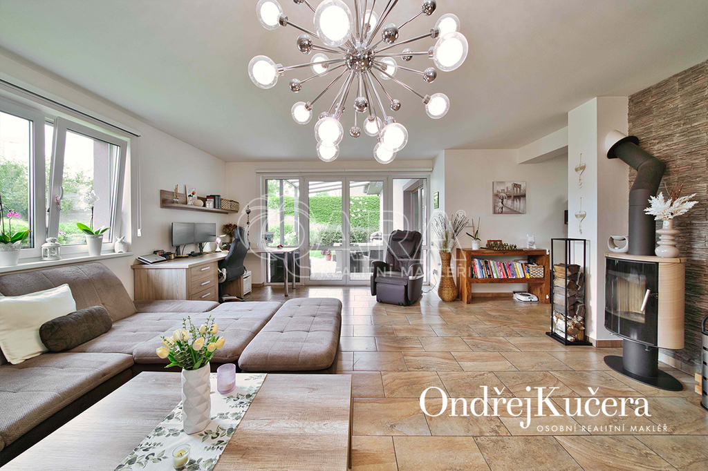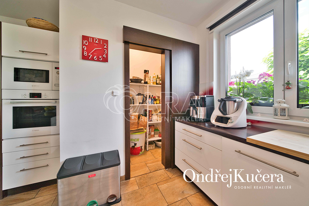 Interiér je navržen prakticky a moderně. Přes zádveří s vestavěnou skříní projdete do jídelny s kuchyní a dále do prostorného obývacího pokoje. Z centrální chodby máte přístup do dvou ložnic se vstupem na terasu. Dále do hlavní samostatné ložnice, prostorné šatny, technické místnosti, koupelny s rohovou vanou, sprchovým koutem a toaletou. Další toaleta je zvlášť. V obývacím pokoji o výměře přes 30 m2 je rodinný krb a vstup na krytou terasu. Kuchyň je od jídelní části oddělena decentním barovým pultem a je vybavena veškerými vestavěnými spotřebiči značek Bosch a Miele, včetně americké lednice. Vedle kuchyně je i samostatná spíž.