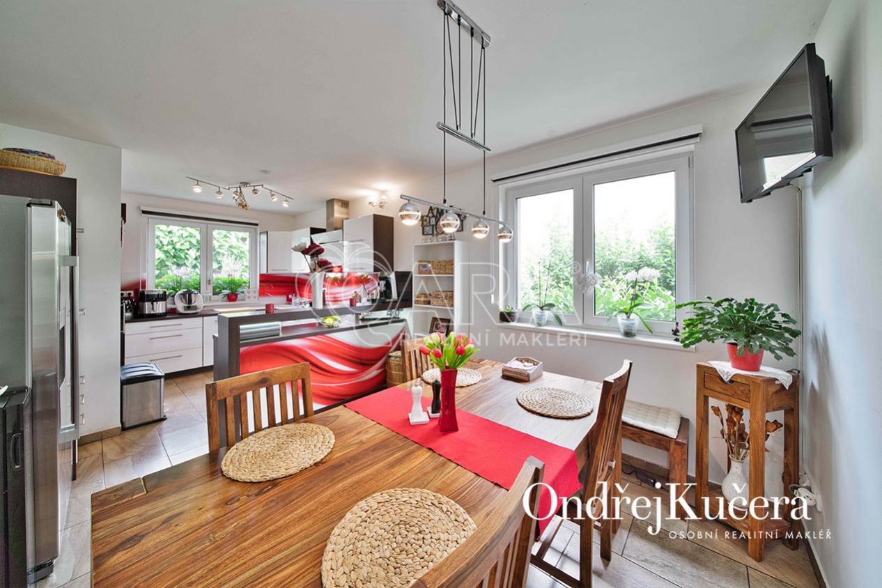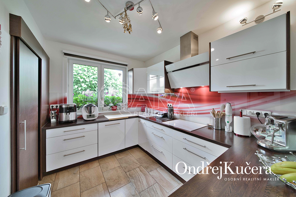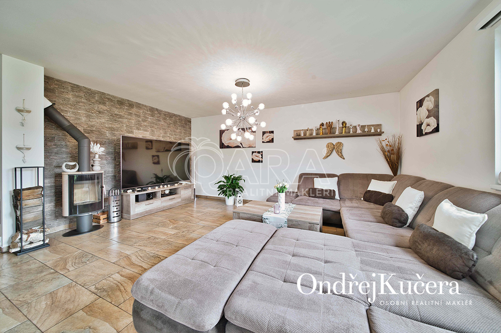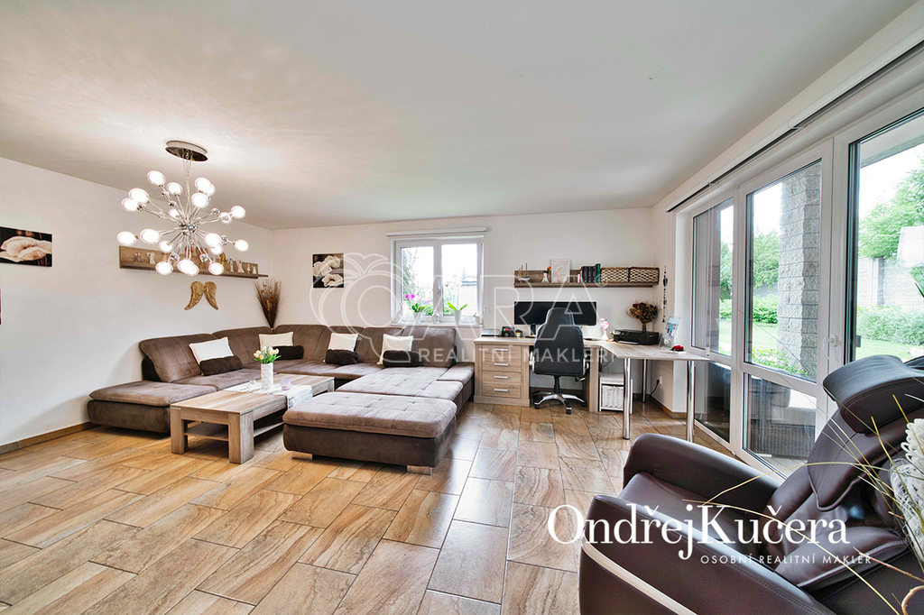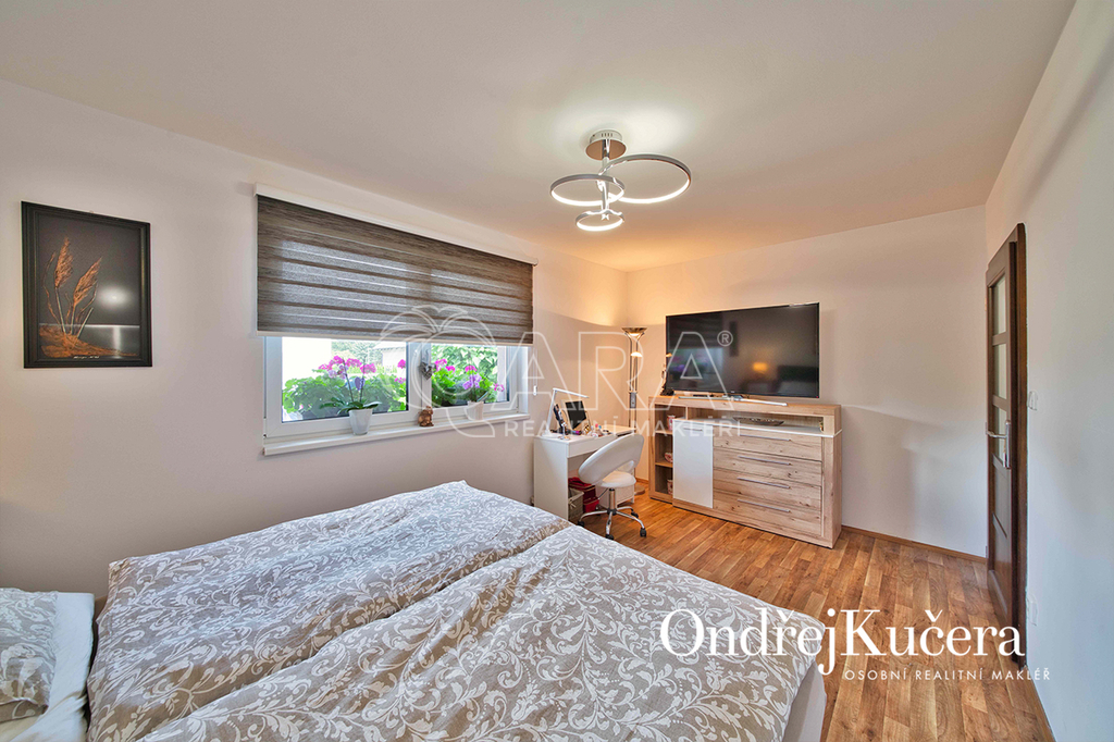 Interiér je navržen prakticky a moderně. Přes zádveří s vestavěnou skříní projdete do jídelny s kuchyní a dále do prostorného obývacího pokoje. Z centrální chodby máte přístup do dvou ložnic se vstupem na terasu. Dále do hlavní samostatné ložnice, prostorné šatny, technické místnosti, koupelny s rohovou vanou, sprchovým koutem a toaletou. Další toaleta je zvlášť. V obývacím pokoji o výměře přes 30 m2 je rodinný krb a vstup na krytou terasu. Kuchyň je od jídelní části oddělena decentním barovým pultem a je vybavena veškerými vestavěnými spotřebiči značek Bosch a Miele, včetně americké lednice. Vedle kuchyně je i samostatná spíž.